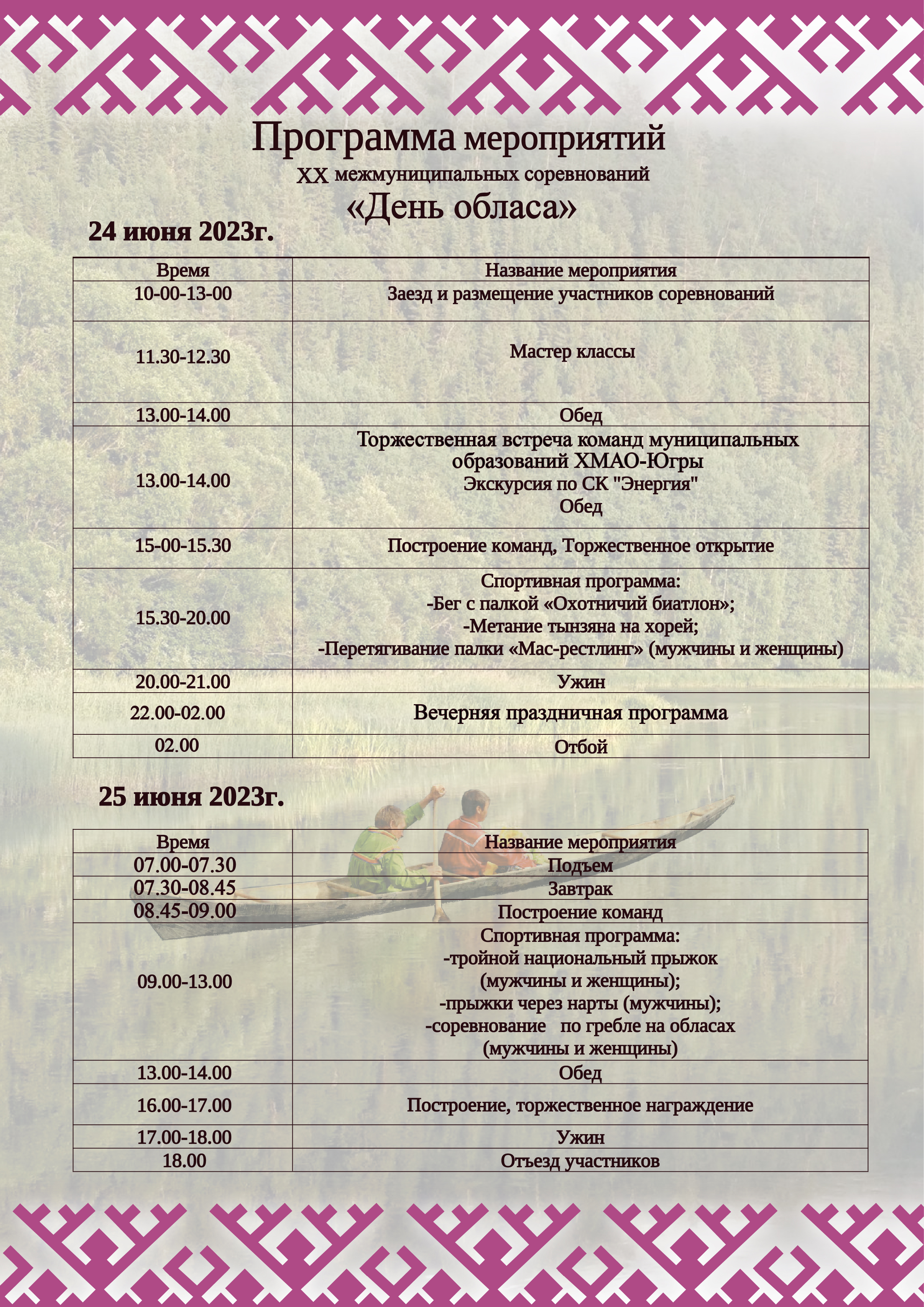 15 июня 202324 – 25 июня в Приобье на базе АО "СУПТР-10" на озере Зеркальное пройдут XX юбилейные районные соревнования «День Обласа».