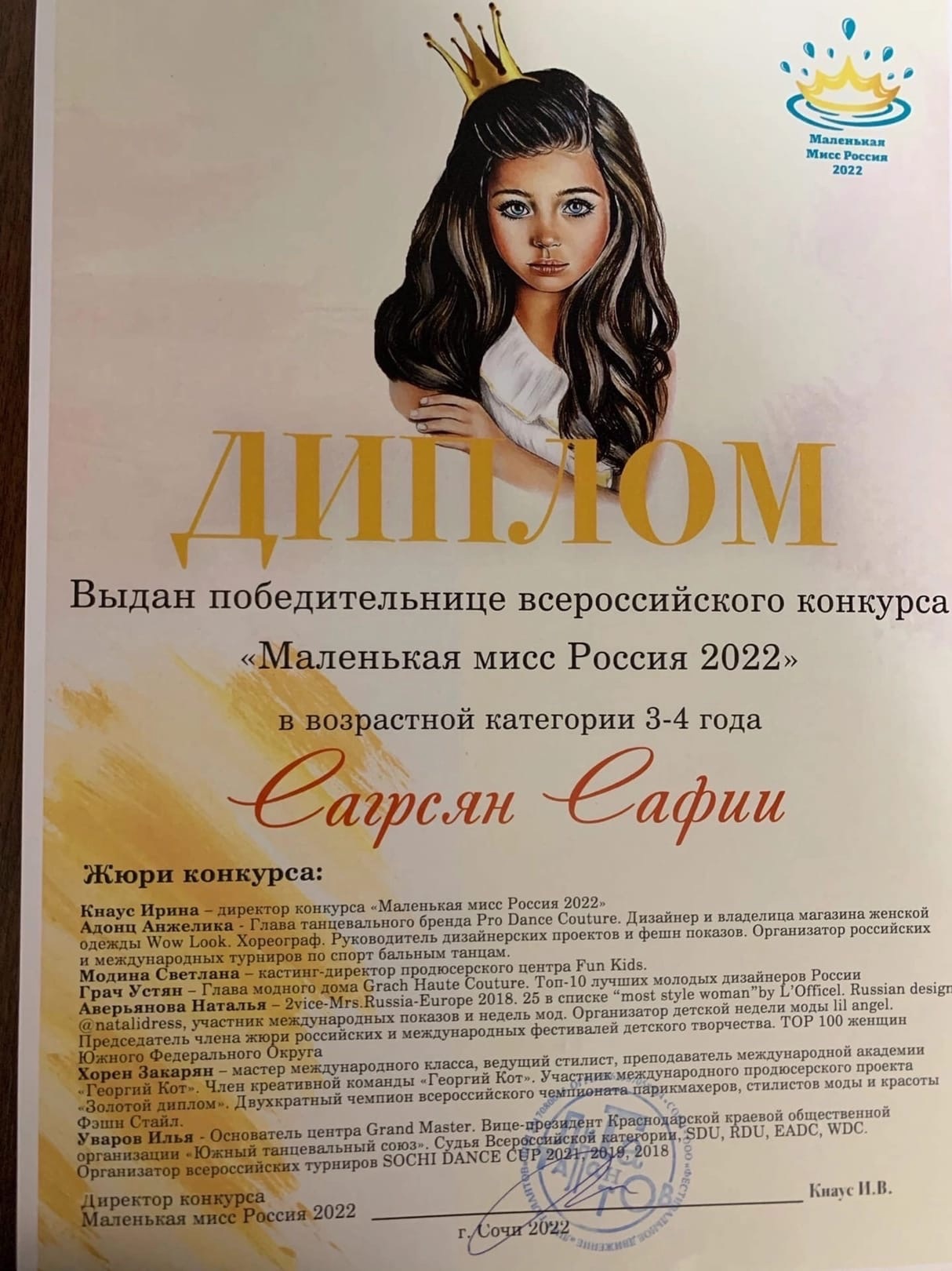 8 сентября 2022Сафия Саргсян из Андры стала победительницей Всероссийского конкурса красоты и таланта «Маленькая Мисс Россия — 2022», который проходил в Сочи с 20 по 25 августа.