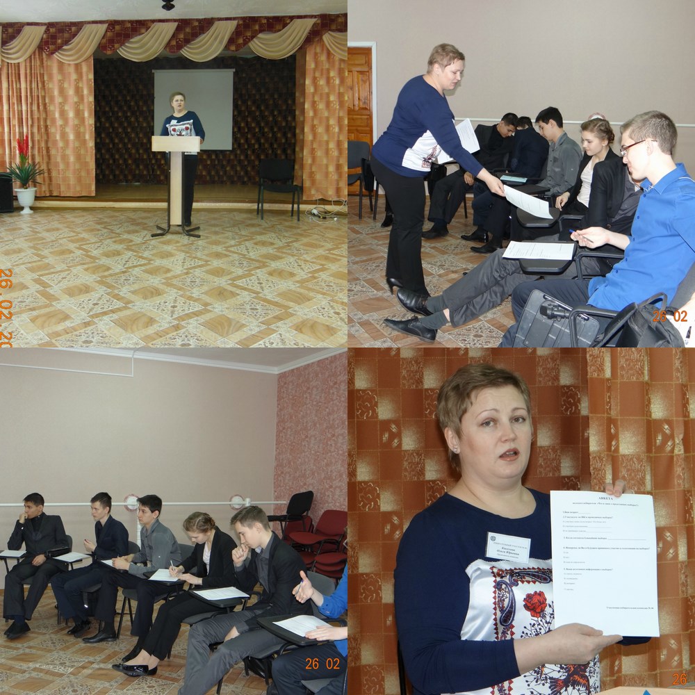 С обучающимися проведено анкетирование на тему «Что я знаю о предстоящих выборах», в результате выявлено, что все опрашиваемые знают о дате проведения выборов в 2016 году, основной источник информации о выборах – телевидение. Большая часть опрашиваемых намерена принимать участие в голосовании на предстоящих выборах (к тому времени им исполнится 18 лет). Ребята задавали вопросы о том, кого будут избирать, о местах расположения избирательных участков, на что получили исчерпывающие ответы. В завершении встречи участникам мероприятия вручили информационные буклеты "Молодому избирателю".