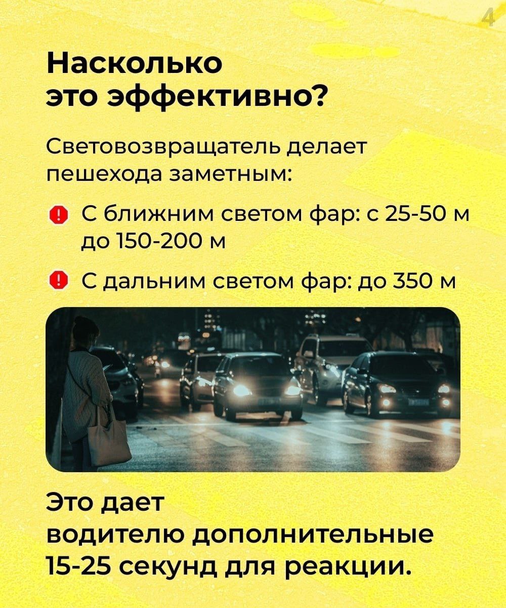 В темное время суток даже на освещенной дороге пешехода почти не видно. Простая световозвращающая нашивка или брелок позволяют водителю заметить человека за 150-200 метров, а не за 25-30.