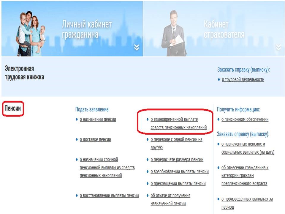 Получившие СМС граждане могут подать заявление на сайте Пенсионного фонда РФ (www.pfr.gov.ru) . Для этого следует пройти авторизацию в Личном кабинете гражданина, использовав учётную запись, которая зарегистрирована для сайта государственных услуг. В разделе ПЕНСИИ для подачи заявления выбрать категорию «О единовременной выплате средств пенсионных накоплений».