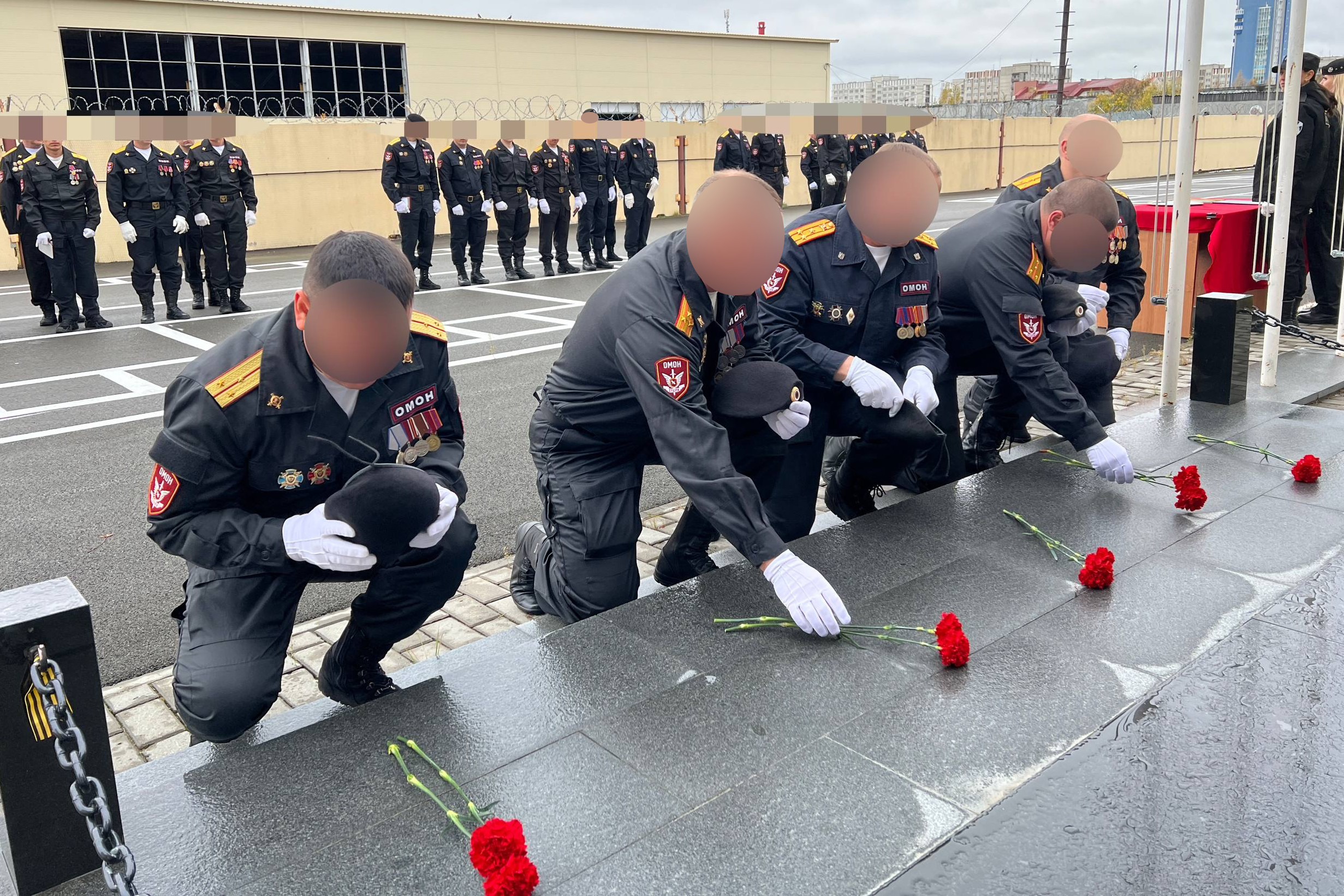 Отдавая дань уважения погибшим боевым товарищам, офицеры и бойцы ОМОН минутой молчания почтили память кавалеров орденов Мужества – прапорщика милиции Сергея Маслакова, старшего сержанта милиции Андрея Козореза и сержанта полиции Виктора Николаева, после чего возложили цветы к подножию мемориалов, где высечены имена героев.
