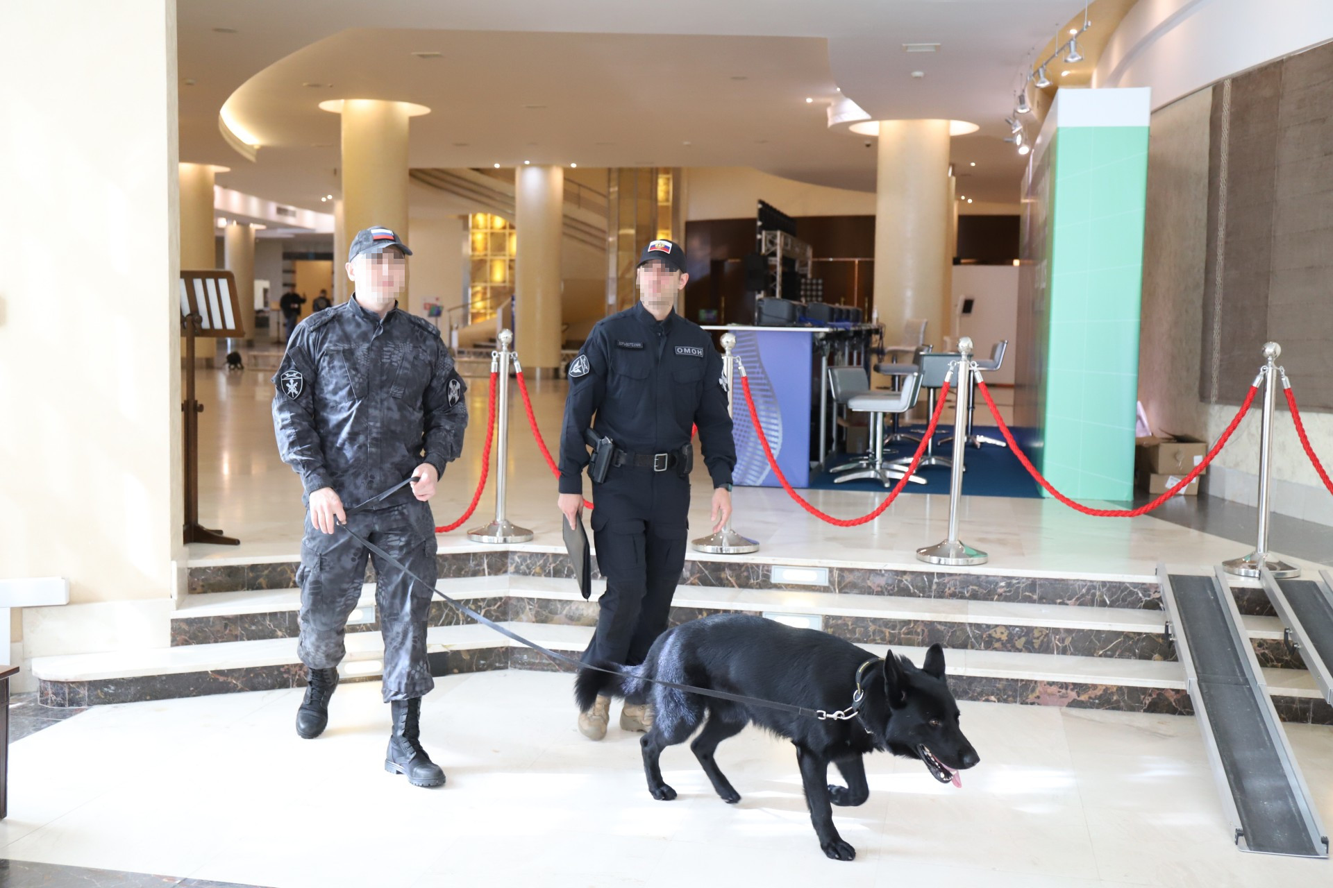 Перед началом мероприятий специалисты группы разминирования ОМОН «Стерх» и инспекторы кинологи с минно-розыскными собаками заблаговременно обследовали места проведения мероприятий и прилегающие к ним территории на отсутствие подозрительных предметов.