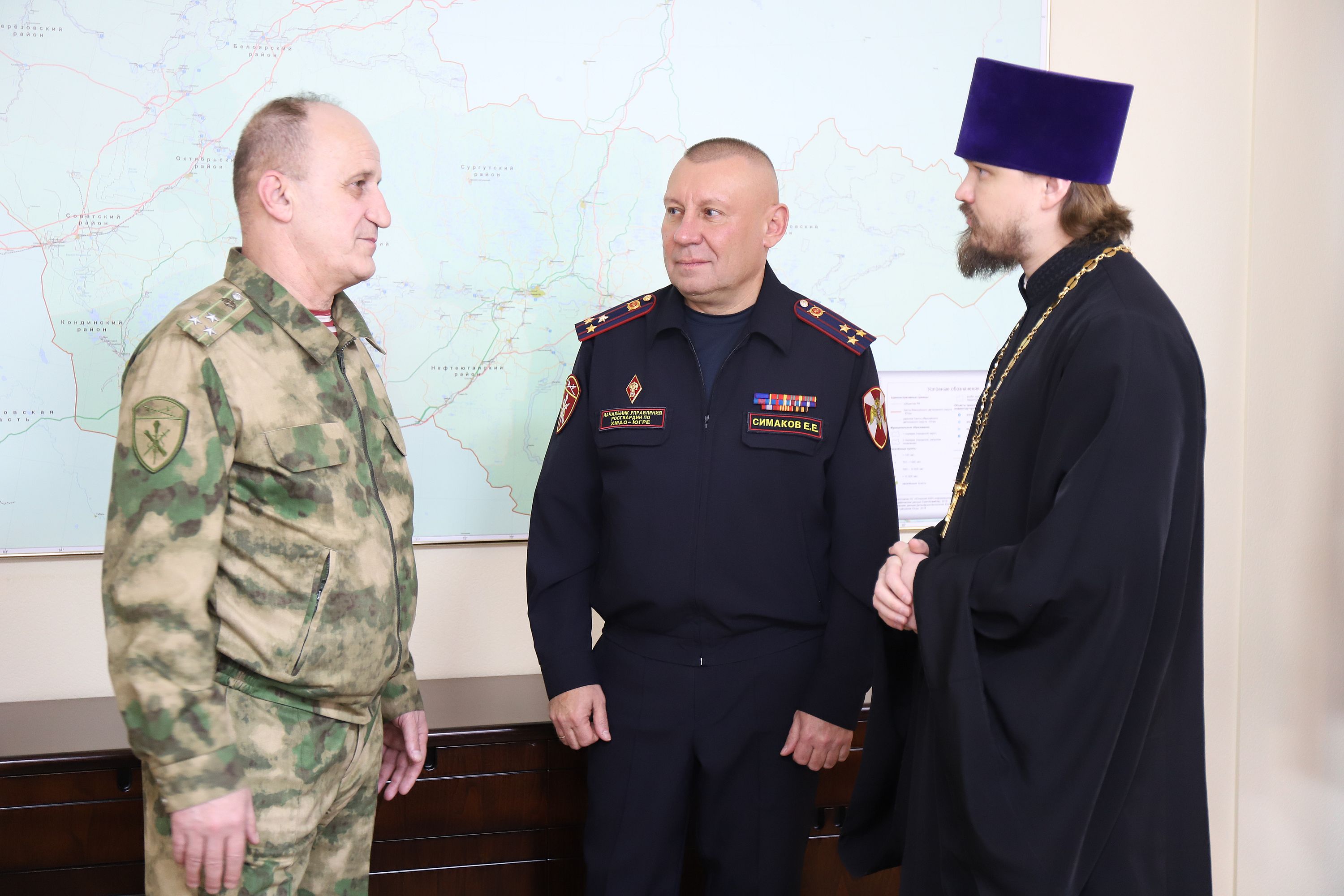 В Ханты-Мансийске заместитель командующего Уральским округом войск национальной гвардии Российской Федерации по военно-политической работе полковник Лом-Али Дааев и начальник Управления Росгвардии по ХМАО-Югре полковник полиции Евгений Симаков встретились с вновь назначенным председателем Ханты-Мансийской Епархии по вопросам взаимодействия с силовыми структурами и казачеством отцом Евгением Кизиным.