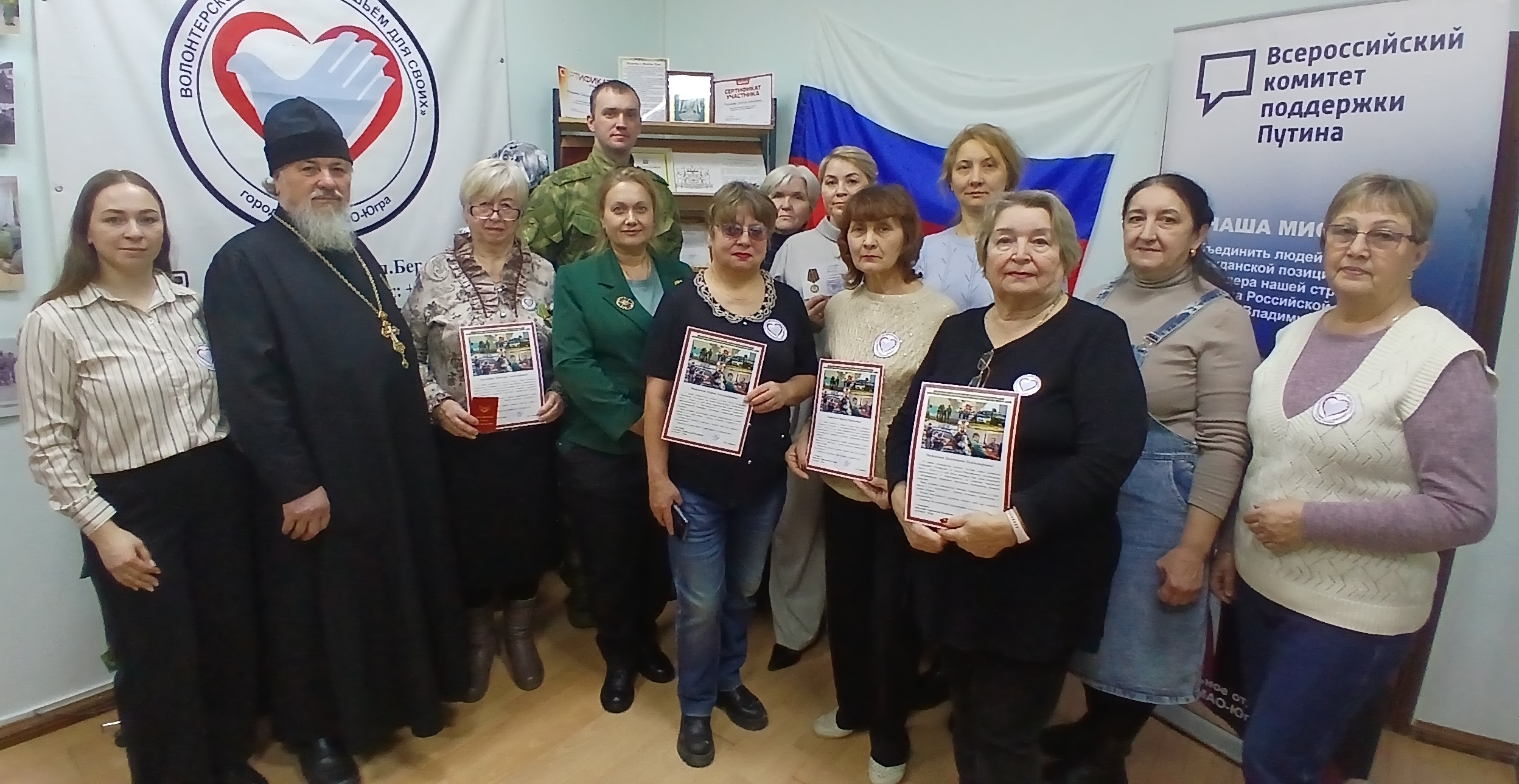В награждении, которое проходило в специализированном волонтерском пункте города, приняли участие также председатель регионального отделения по ХМАО – Югре Всероссийского комитета поддержки В.В. Путина Елена Ситникова, руководитель волонтёрского движения «Шьем для своих» Светлана Малышева и протоиерей Югорской епархии Иоанн Юрцун.