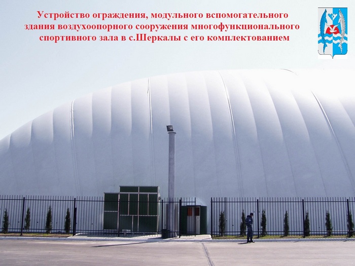 -Устройство ограждения, модульного вспомогательного здания воздухоопорного сооружения многофункционального спортивного зала в селе Шеркалы с его комплектованием.