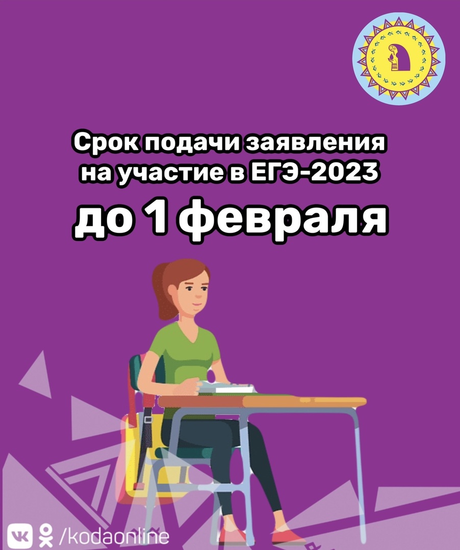 27 января 2023Федеральная служба по надзору в сфере образования и науки напоминает, что заявление на участие в ЕГЭ 2023 года можно подать до 1 февраля включительно.