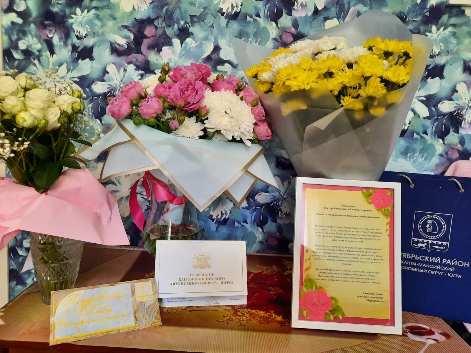 В праздничный день супругов поздравили представители администрации сельского поселения Перегребное и Совета ветеранов, вручили поздравительный адрес от Губернатора Югры Руслана Николаевича Кухарука и главы Октябрьского района Сергея Владимировича Заплатина.