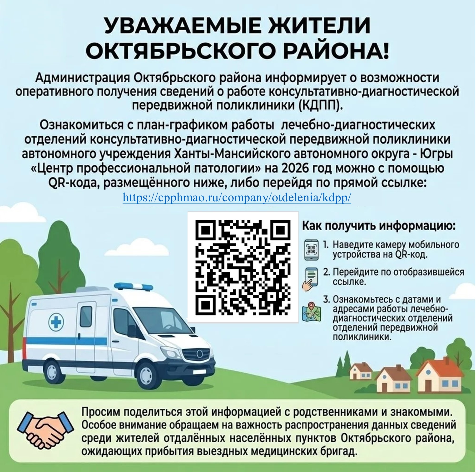 Просим поделиться этой информацией с родственниками и знакомыми. Особое внимание обращаем на важность распространения данных сведений среди жителей отдалённых населённых пунктов Октябрьского района, ожидающих прибытия выездных медицинских бригад.