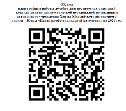 Ознакомиться с план-графиком работы лечебно-диагностических отделений консультативно-диагностической передвижной поликлиники автономного учреждения Ханты-Мансийского автономного округа – Югры «Центр профессиональной патологии» на 2026 год можно с помощью QR-кода, размещённого ниже, либо перейдя по прямой ссылке: https://cpphmao.ru/company/otdelenia/kdpp/