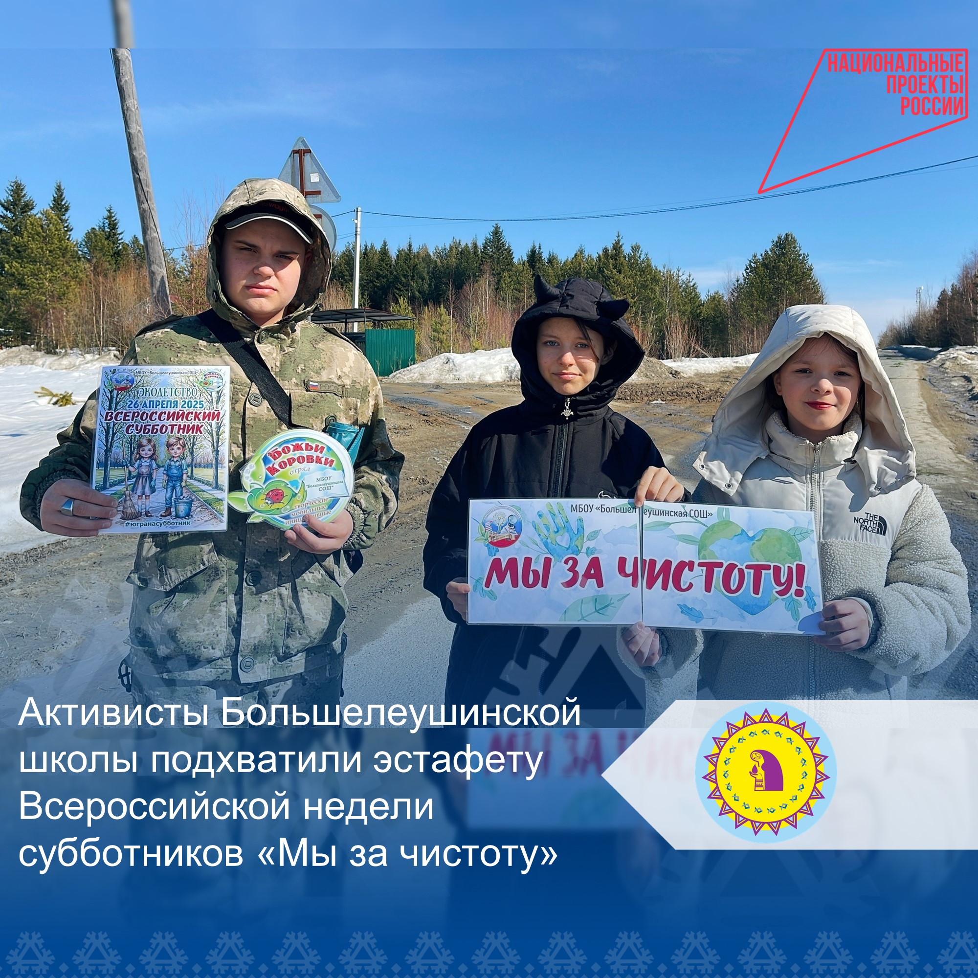 Участниками Всероссийской недели субботников «Мы за чистоту» стали более 570 тысяч человек по всей России. Активисты молодёжных организаций, участники Движения Первых и неравнодушные россияне благоустроили памятные мемориалы, природные и прибрежные территории, устроили экологические пикники и забеги. В числе участников - ученики и волонтеры Большелеушинской школы.