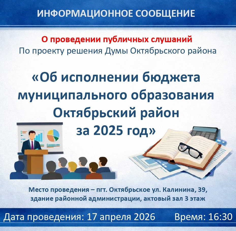 Информационное сообщение о проведении публичных слушаний по проекту решения Думы Октябрьского района «Об исполнении бюджета муниципального образования Октябрьский район за 2025 год»