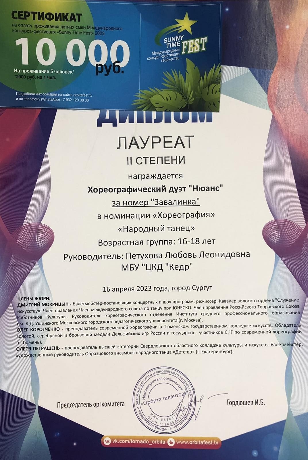 По итогам конкурса коллектив «Нюанс» награжден дипломом Лауреата II степени и сертификатом в номинал 10000 рублей.