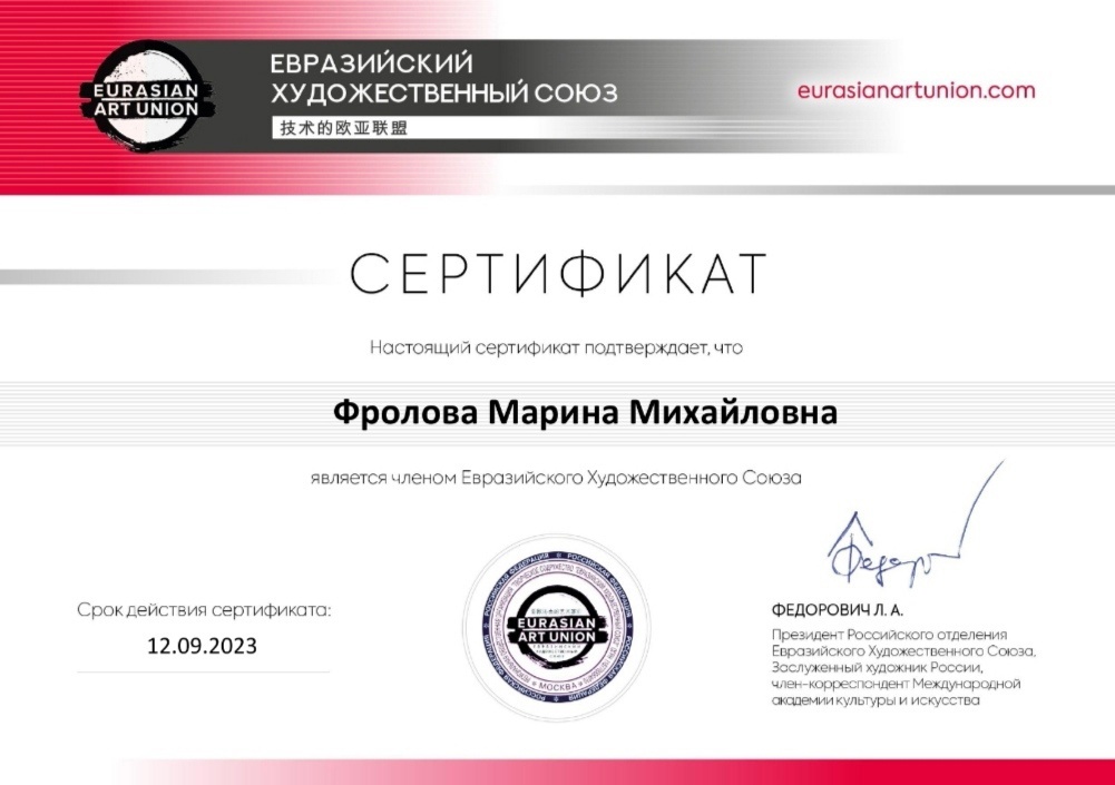 Поздравляем Марину Фролову с вступлением в Евразийский Художественный Союз и желаем успехов в творческом пути!