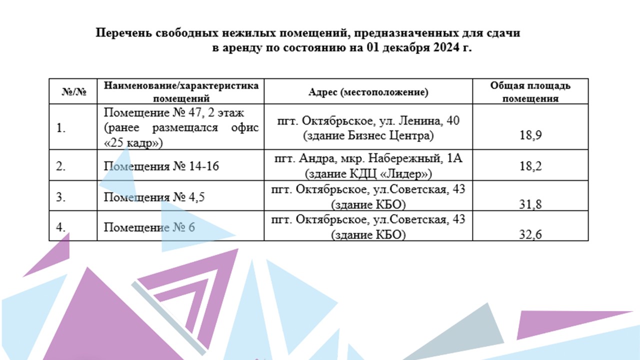 5 декабря 2024Комитет по управлению муниципальной собственностью администрации Октябрьского района сообщает о предоставлении свободных помещений для размещения своего бизнеса, и осуществления деятельности в сфере социального предпринимательства в качестве имущественной поддержки.