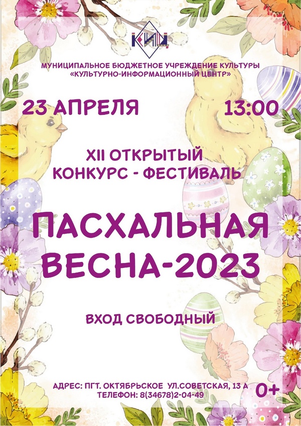 20 апреля 202323 апреля в районном центре на базе Культурно-информационного центра состоится XII открытый конкурс-фестиваль "Пасхальная весна-2023".