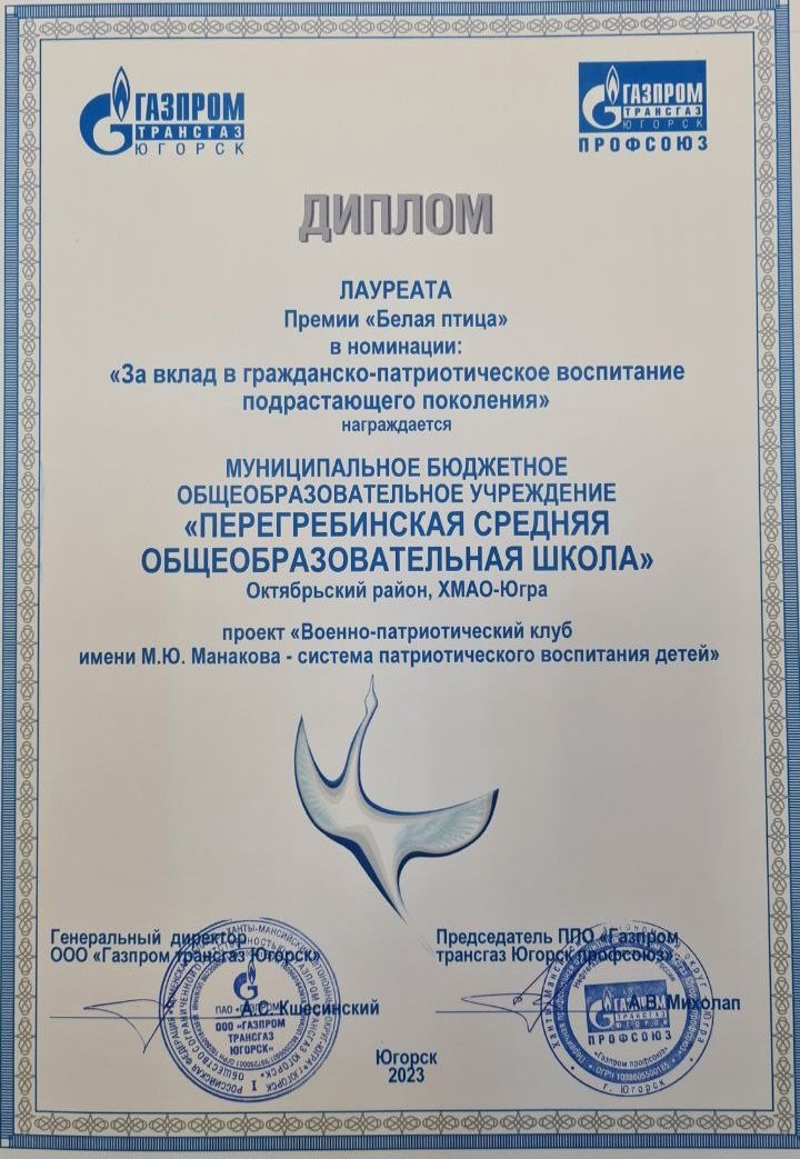 20 декабря 2023Перегребинская школа признана лауреатом в номинации «За вклад в гражданско-патриотическое воспитание подрастающего поколения». Образовательная организация презентовала работу военно-патриотического клуба им. Манакова М.Ю.