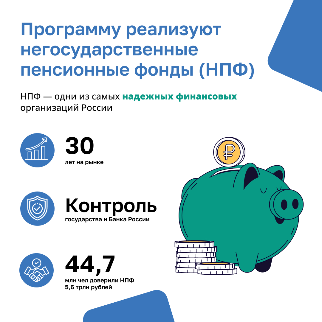 Негосударственный пенсионный фонд (НПФ), который вы выберете, будет инвестировать ваши средства, чтобы приумножить сбережения. При выполнении определённых условий вы получите от государства прибавку к своим сбережениям.