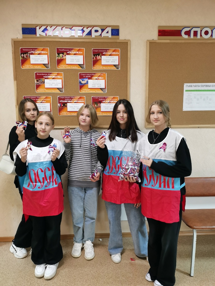 Юные волонтеры района вручают землякам ленточки-триколоры, рассказывают об истории флага России, поздравляют с Государственным праздником.