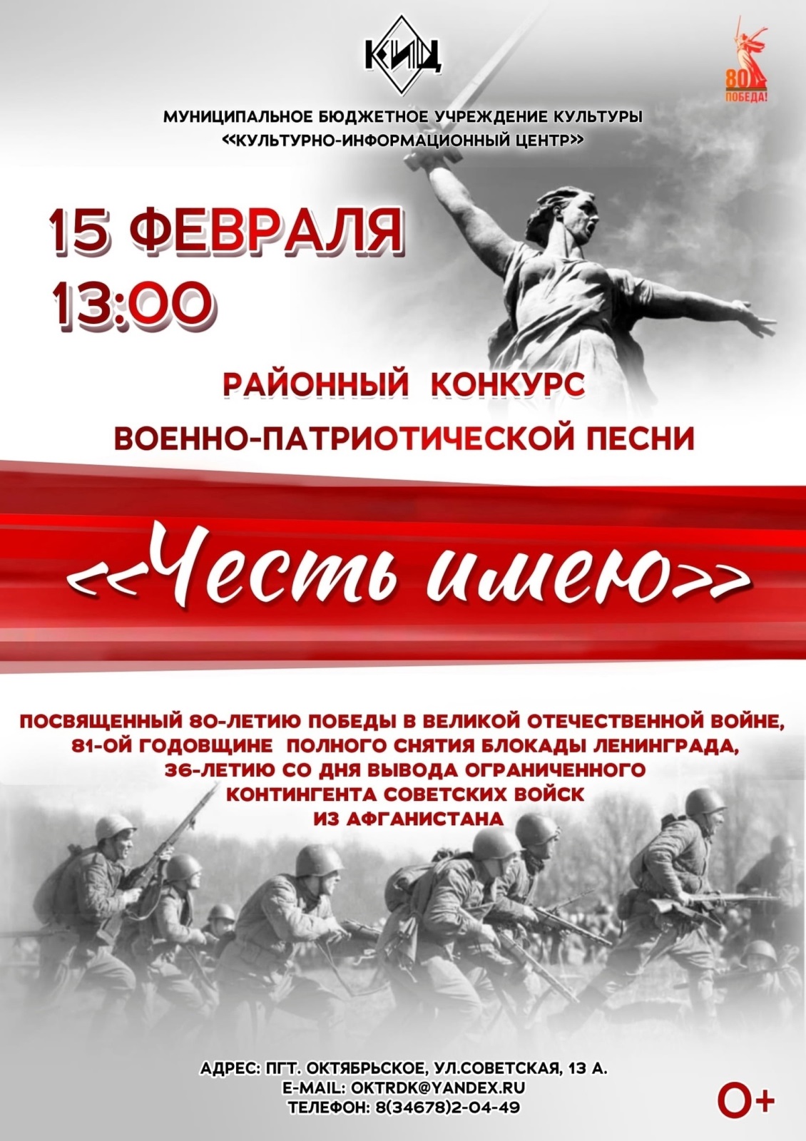 14 февраля 2025Культурно-информационный центр вновь распахнет свои двери для участников районного конкурса военно-патриотической песни «Честь имею!».