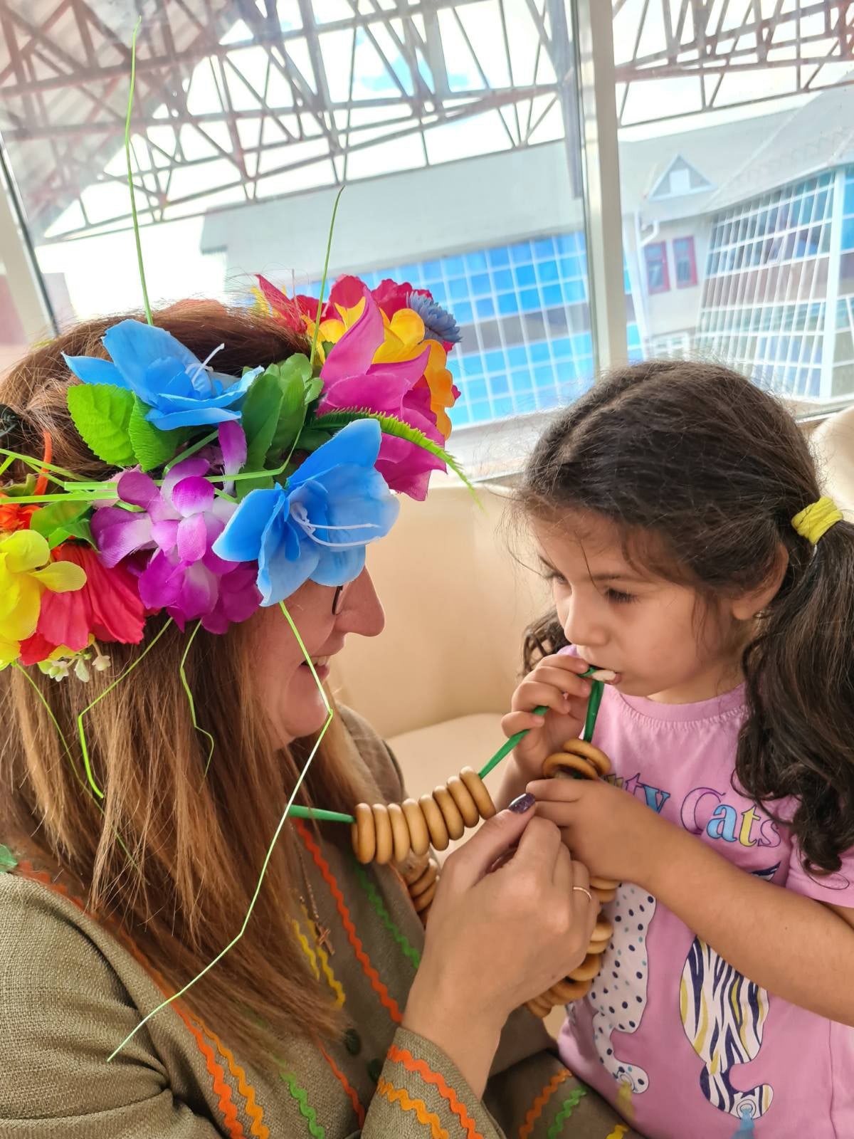 Прощаясь, Осень подарила ребятам ароматные яблочки и раскраски, а ребята подарили виновнице праздника съедобные бусы, которые они сделали сами.