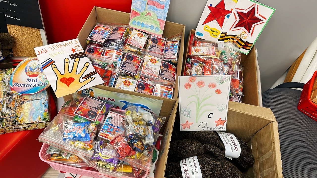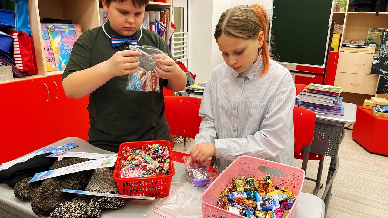 Так, например, на этой неделе активисты завершили упаковку индивидуальных пакетиков со сладостями. В преддверии Дня защитника Отечества школьники вложили в каждый пакетик открытку с 23 февраля, оформили очередную партию носков, организовали сбор продуктов быстрого питания.