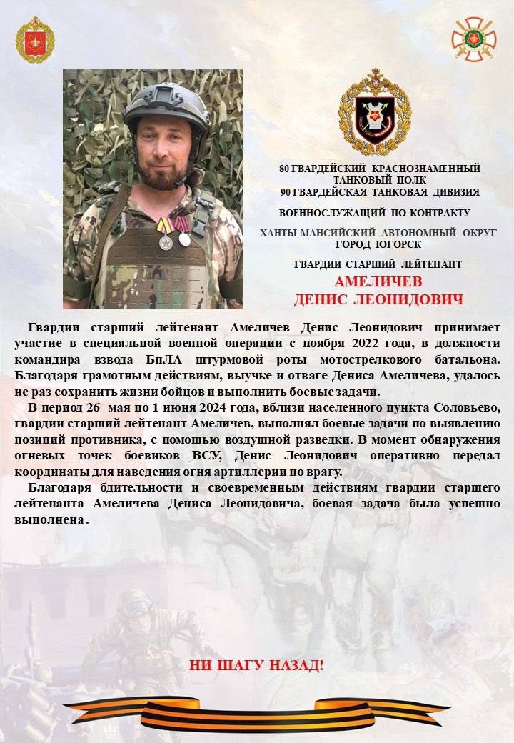 Так, с 26 мая по 1 июня вблизи населенного пункта Соловьево подразделение Дениса Амеличева занималось выявлением позиций противника с помощью воздушной разведки. В момент обнаружения огневых точек боевиков ВСУ офицер оперативно передал координаты для наведения огня артиллерии. Благодаря бдительности и своевременным действиям бойца задача была успешно выполнена.