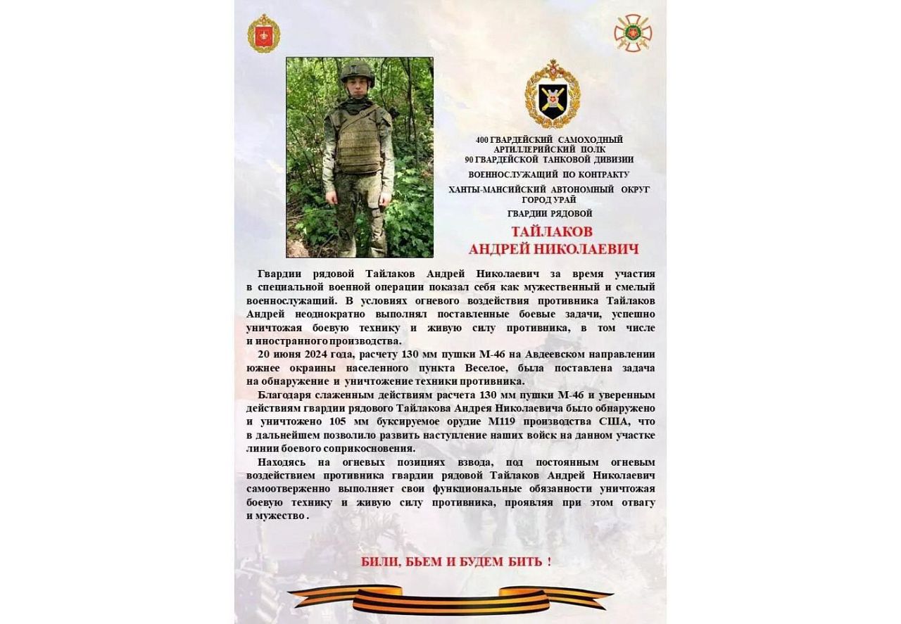 20 июня 2024 года, благодаря слаженным действиям расчета на Авдеевском направлении южнее окраины Веселого и уверенным действиям гвардии рядового Андрея Тайлакова, было обнаружено и уничтожено 105-миллиметровое буксируемое орудие М119 производства США. Эта копия британской гаубицы предназначена для поддержки пехоты, десантных войск и штурмовых групп, эффективно уничтожает легкобронированную технику, фортификационные сооружения и скопления живой силы. На вооружении данная модель сравнительно недавно – с 1989 года, таскают ее по передовой колесные машины высокой проходимости HMMWV – «Хамви».
