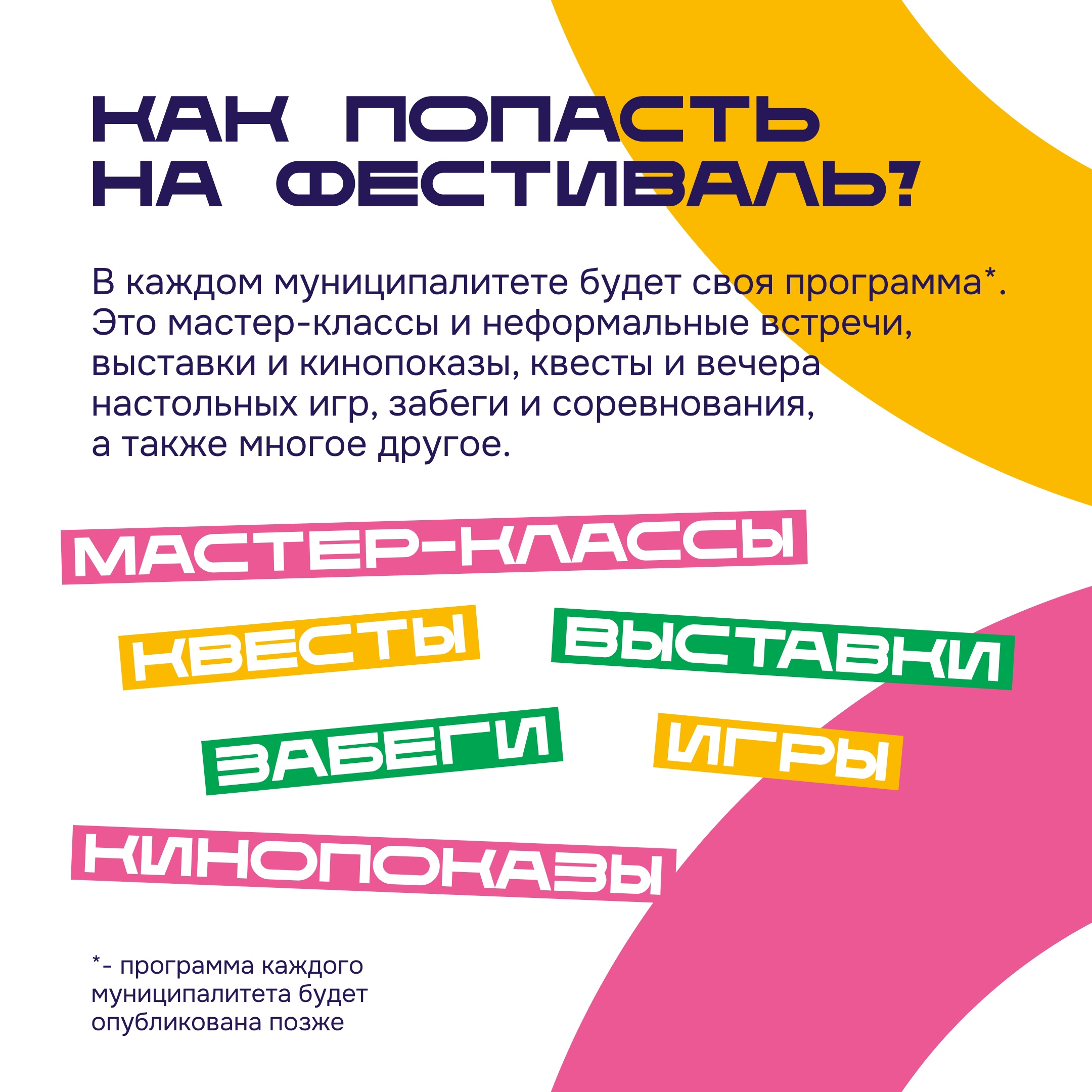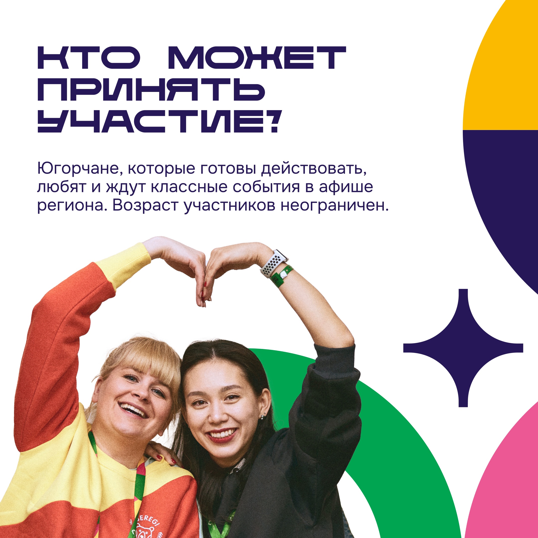 За три фестивальных дня каждый участник сможет научиться чему-то новому, культурно провести время и расширить кругозор, творчески вдохновиться, сделать доброе дело, улучшить настроение и укрепить здоровье, а также узнать больше о возможностях для молодых людей в Югре.