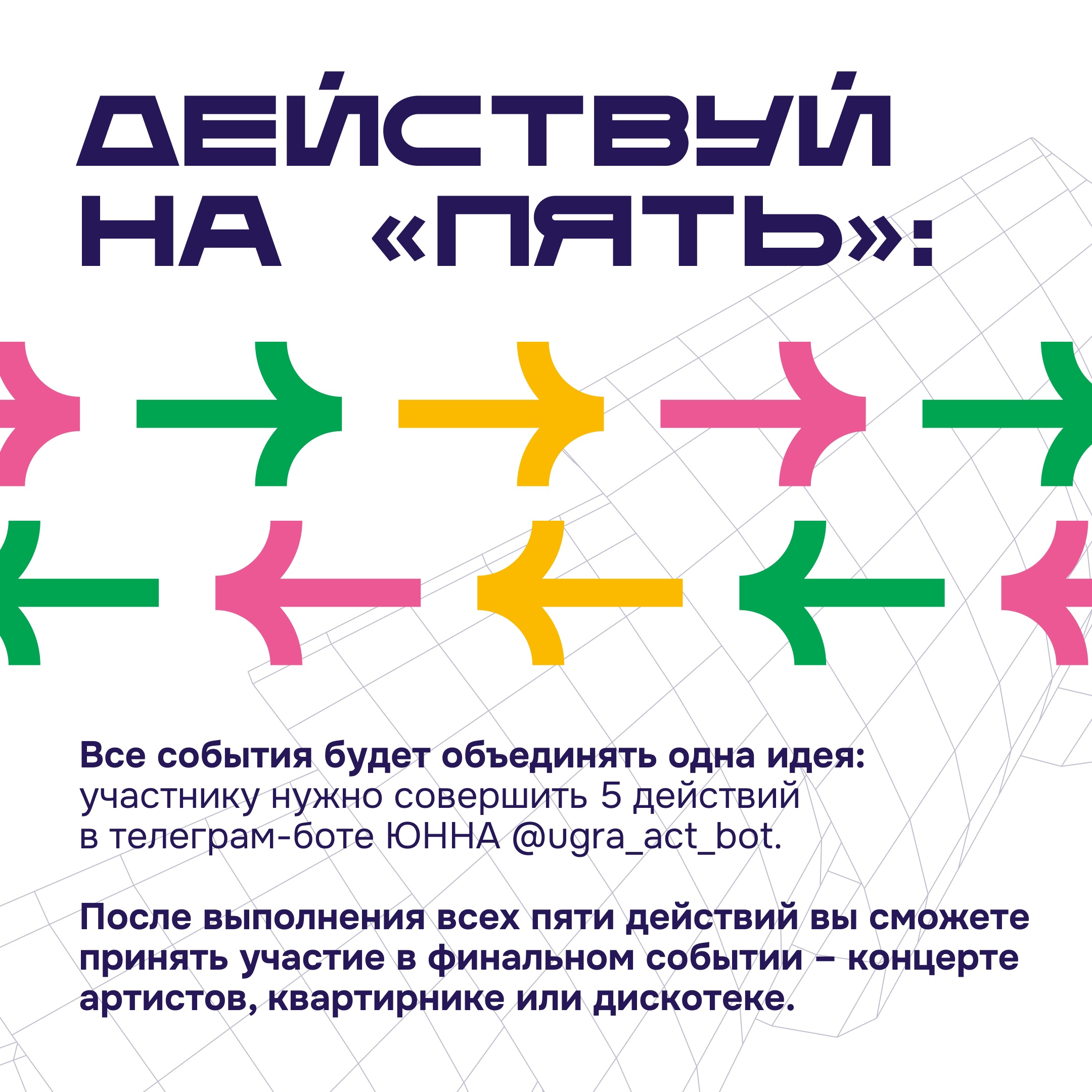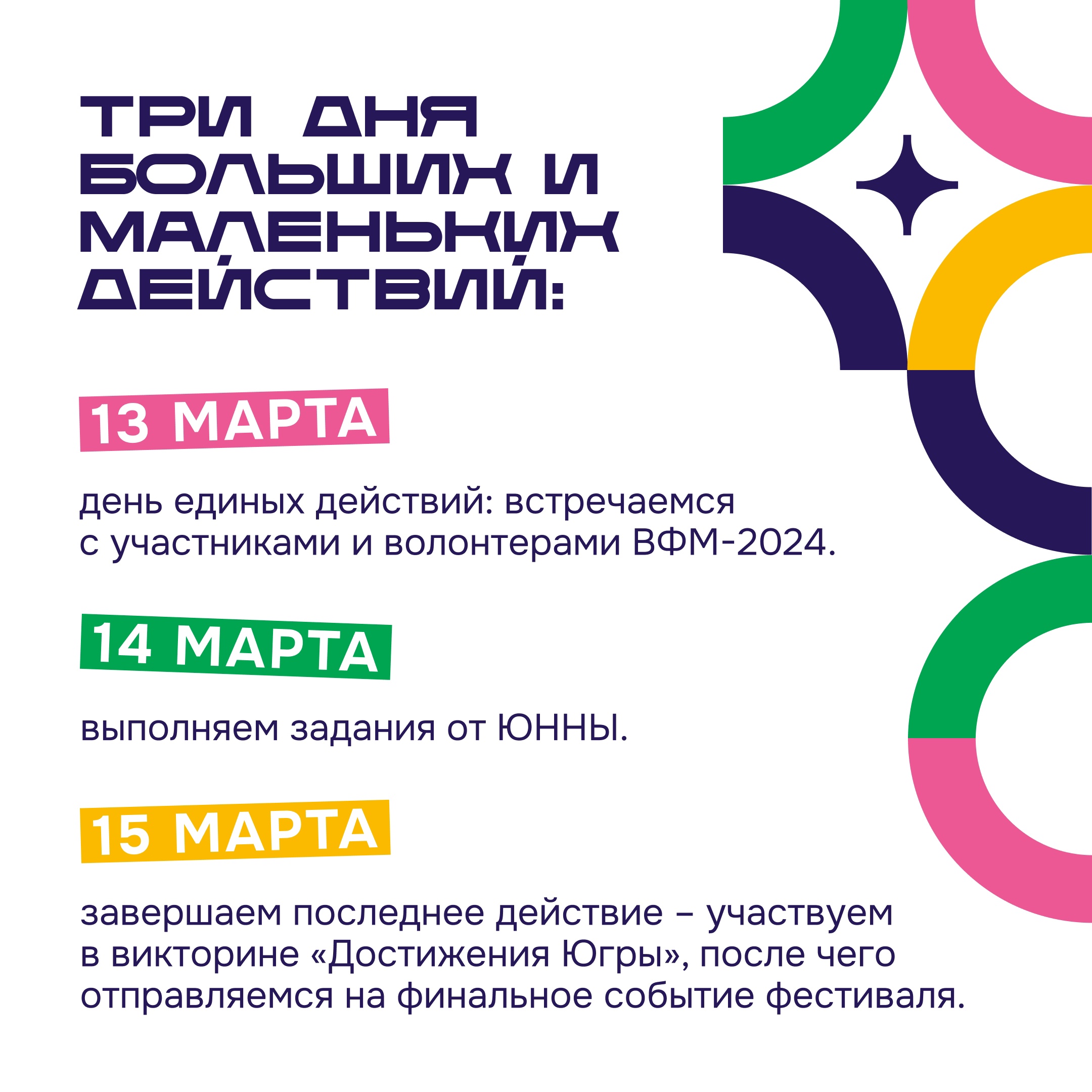 5 марта 2024С 13 по 15 марта в 22 муниципалитетах Югры вас ждут десятки событий, объединенных одной идеей — выполнение 5 действий, которые приведут вас к захватывающему финальному событию.