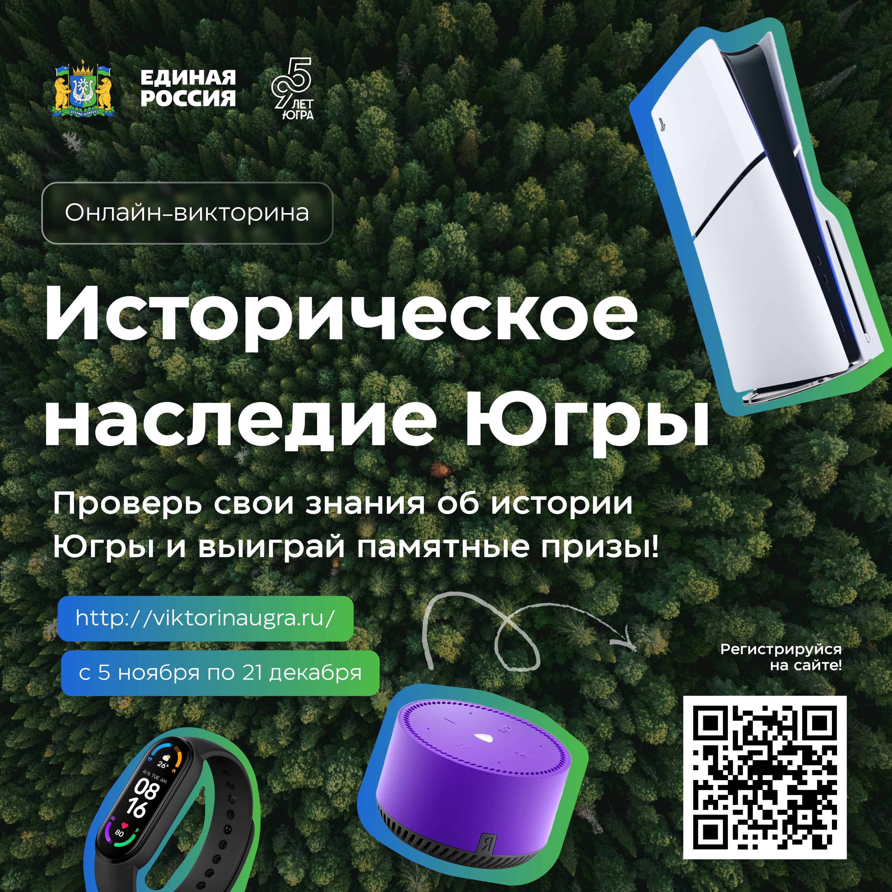 На сайте онлайн-викторины «Историческое наследие Югры» (https://viktorinaugra.ru) жители автономного округа от 18 лет и старше могут проверить свои знания по истории становления региона. Для этого необходимо до 21 декабря пройти регистрацию и ответить на 3 вопроса, посвящённые 80-летию Победы в Великой Отечественной войне, 95-летию региона и юбилейным датам нефтегазовых месторождений. Победители будут определены генератором случайных чисел. Среди участников онлайн-викторины будет разыграно более 100 призов, в том числе игровая приставка, телевизор, «умная» колонка, робот-пылесос и другая электронная техника.