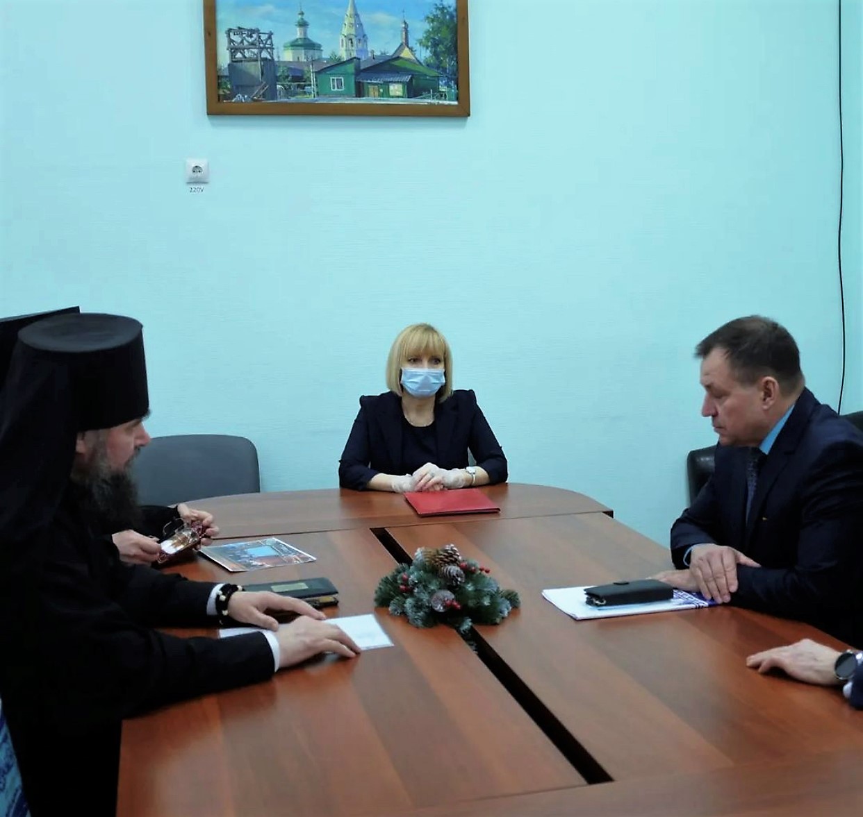 Секретарь местного отделения партии «Единая Россия» Октябрьского района Евгений Соломаха, глава Октябрьского района, член политсовета Сергей Заплатин и его заместитель по социальным вопросам Татьяна Киселева, настоятель Свято-Троицкого архиерейского подворья игумен Алипий обсудили с Владыкой Фотием вопросы взаимодействия властей района и Югорской епархии. В частности, перспективы строительства братского корпуса при Свято-Троицком монастыре в Октябрьском, храма в Малом Атлыме, а также возможность восстановления исторического памятника архитектуры - Спасской церкви в селе Шеркалы.