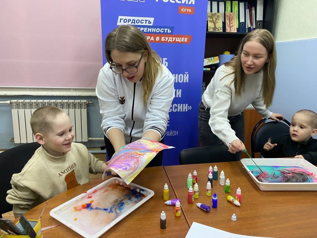 На базе Штаба общественной поддержки «Единой России» руководитель Местной общественной приемной партии Наталия Кочук совместно с психологом Приобской начальной школы Анастасией Орловой провели индивидуальный мастер-класс «Краски жизни» для супруги и сыновей военнослужащего. Под руководством психолога дети с мамой рисовали яркие картины в технике «Эбру».