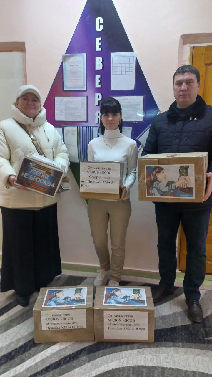 Коллектив, воспитанники и родители детского сада «Северяночка» поселка Приобье присоединились к региональной благотворительной акции «Югра — защитникам Отечества», организованной партией «Единая Россия».