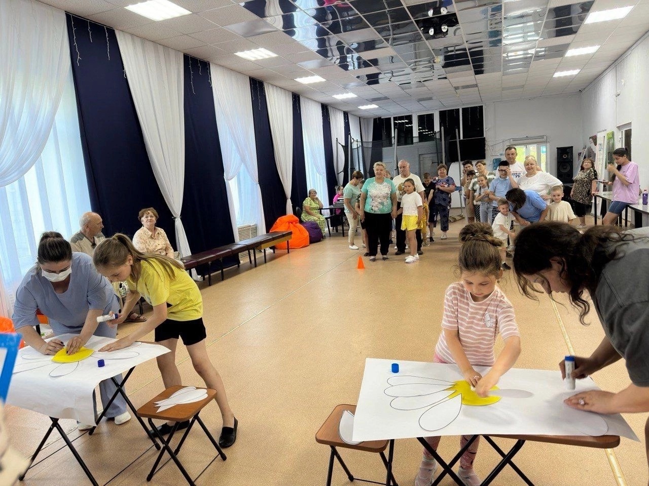 Более 20 семей в составе с дедушками, бабушками, родителями и их детьми приняли участие в конкурсной программе. Дружно делали аппликации в виде символа праздника - ромашки, водили хороводы, собирали башни из пластиковых стаканов и выполняли задания на скорость.