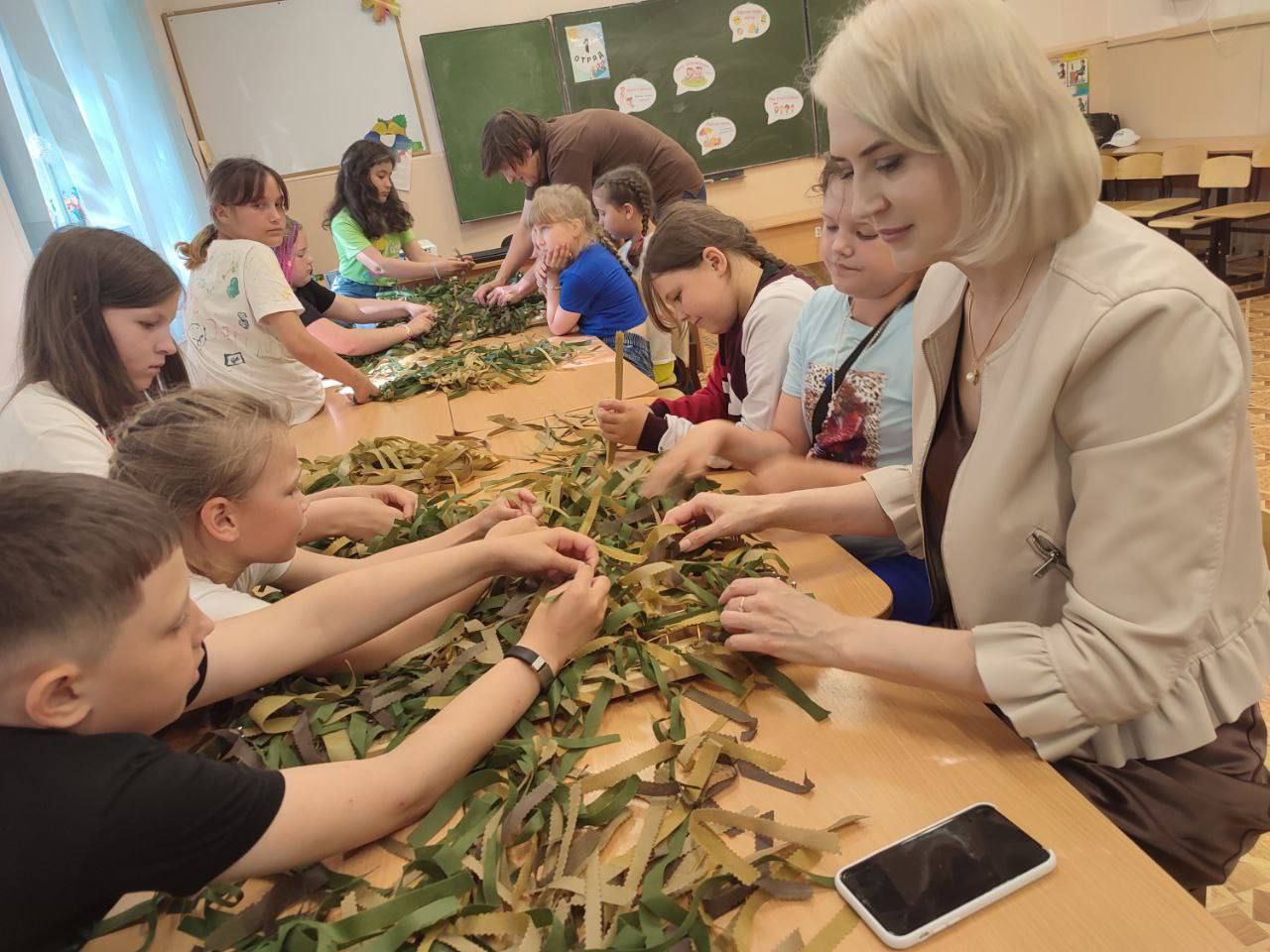 В Приобье партийцы Октябрьского района научили школьников делать маскировочные нашлемники для бойцов СВО