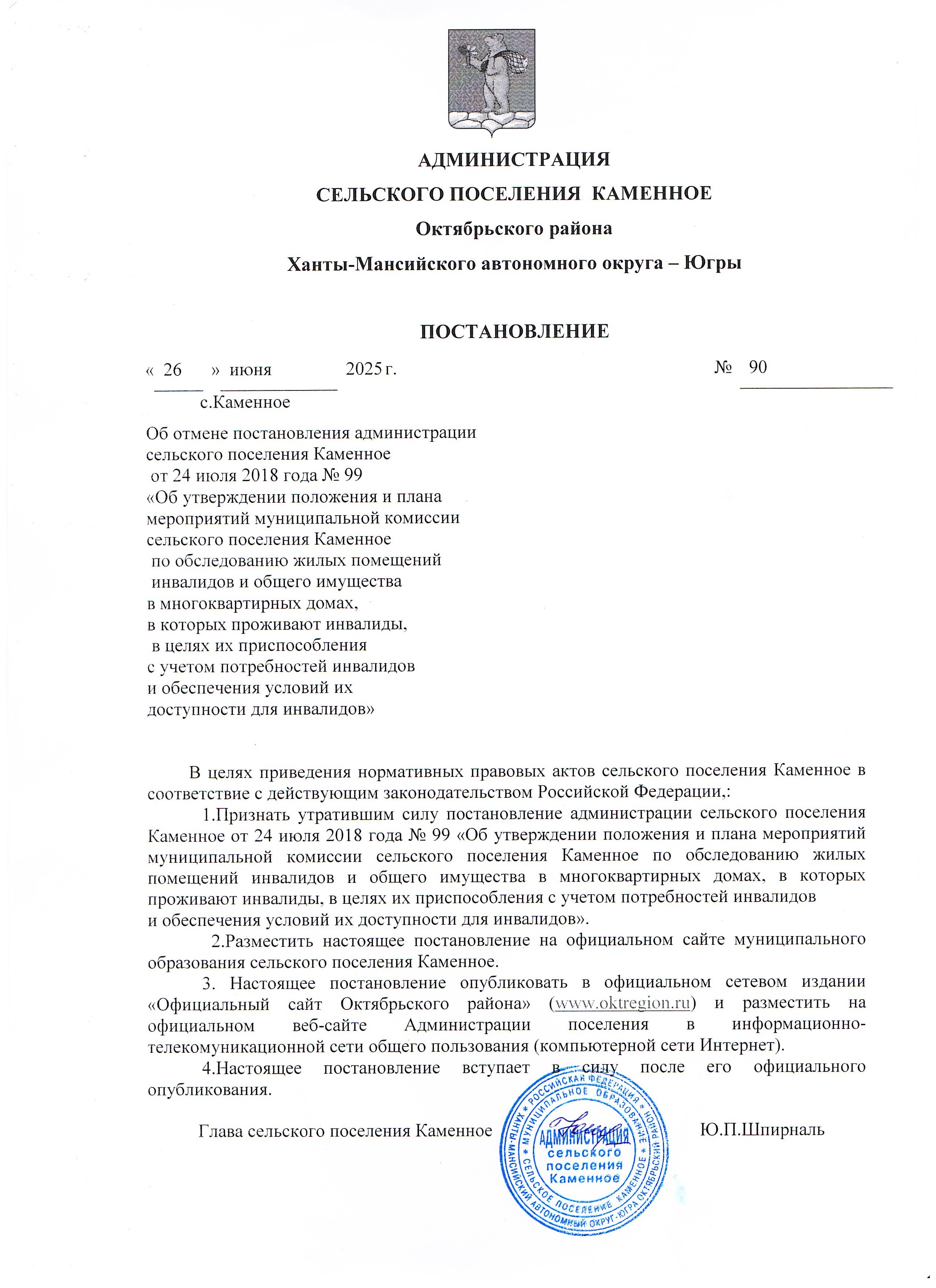 «Постановление администрации От 26.06.2025 года № 90 «Об отмене постановления администрации сельского поселения Каменное от 24 июля 2018 года № 99 «Об утверждении положения и плана мероприятий муниципальной комиссии сельского поселения Каменное по обследо