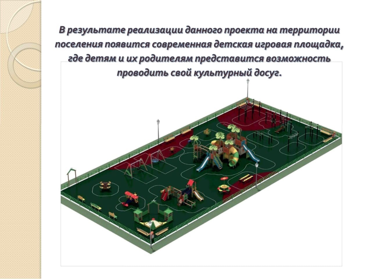 Дизайн-проект детской площадки уже разработан, и главным его отличием будет бесшовное, мягкое и безопасное покрытие, благодаря которому существенно снижается риск травматизма во время подвижных и активных игр.