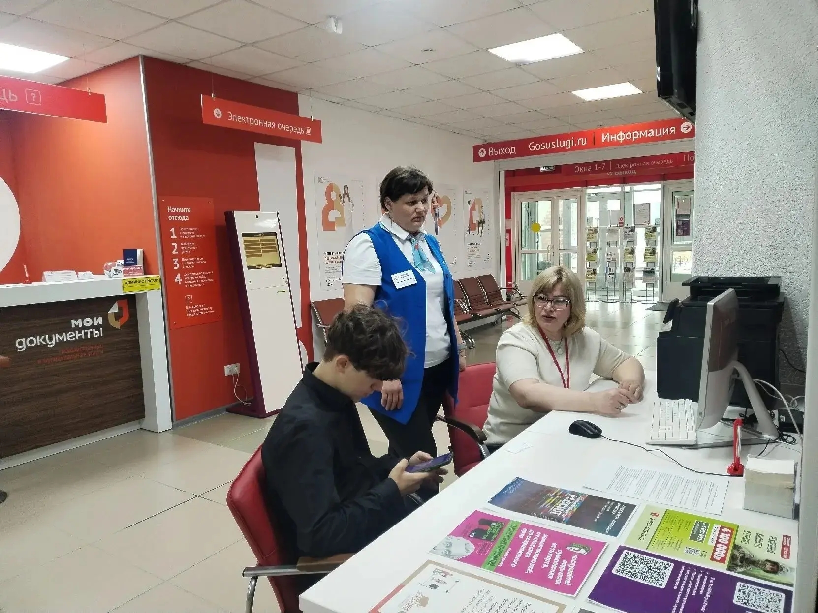В рамках проекта «Моя карьера с Единой Россией» учащиеся 8 «Б» класса Октябрьской средней общеобразовательной школы имени героя Советского Союза Николая Архангельского посетили многофункциональный центр Октябрьского района.