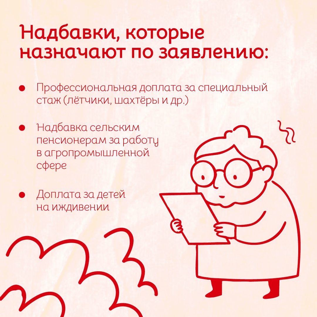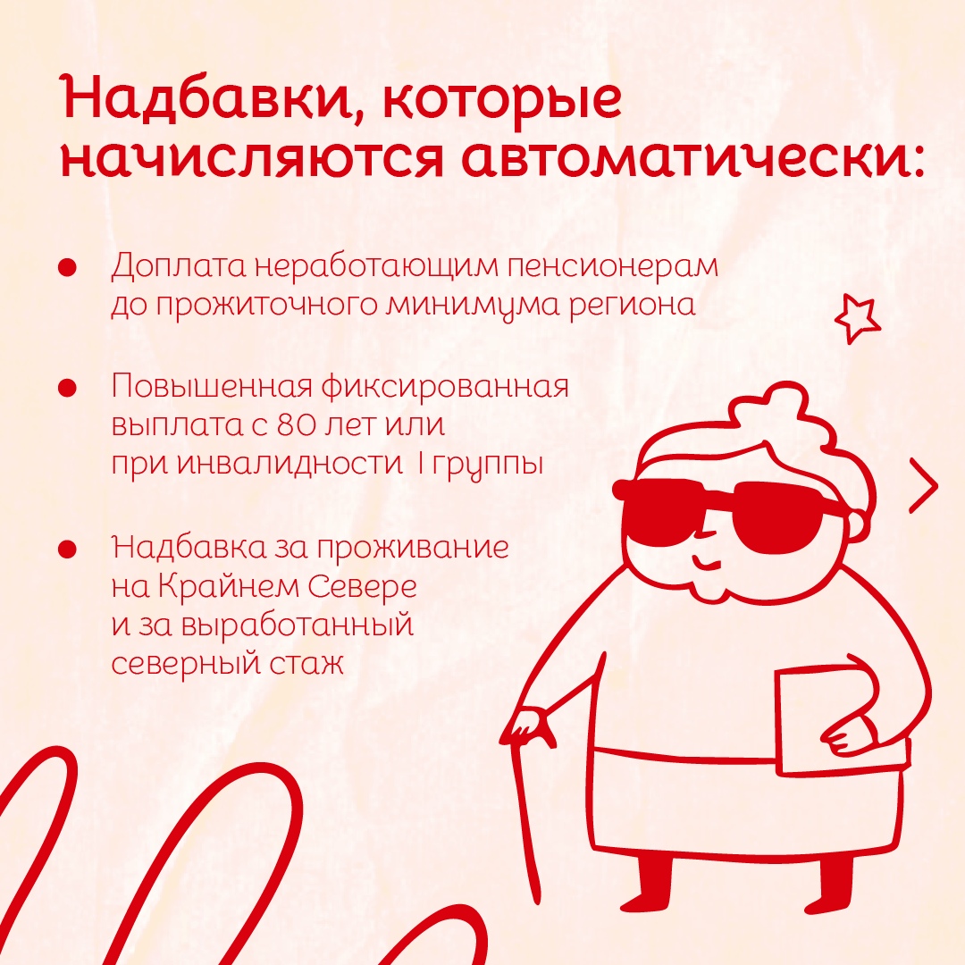 Соцфонд назначает надбавки к пенсии в зависимости от возраста, места жительства и стажа работы. Многие выплаты начисляются автоматически — обращаться лично не требуется. Данные передаются между ведомствами в цифровом формате. Подробнее о видах надбавок смотрите в карточках.