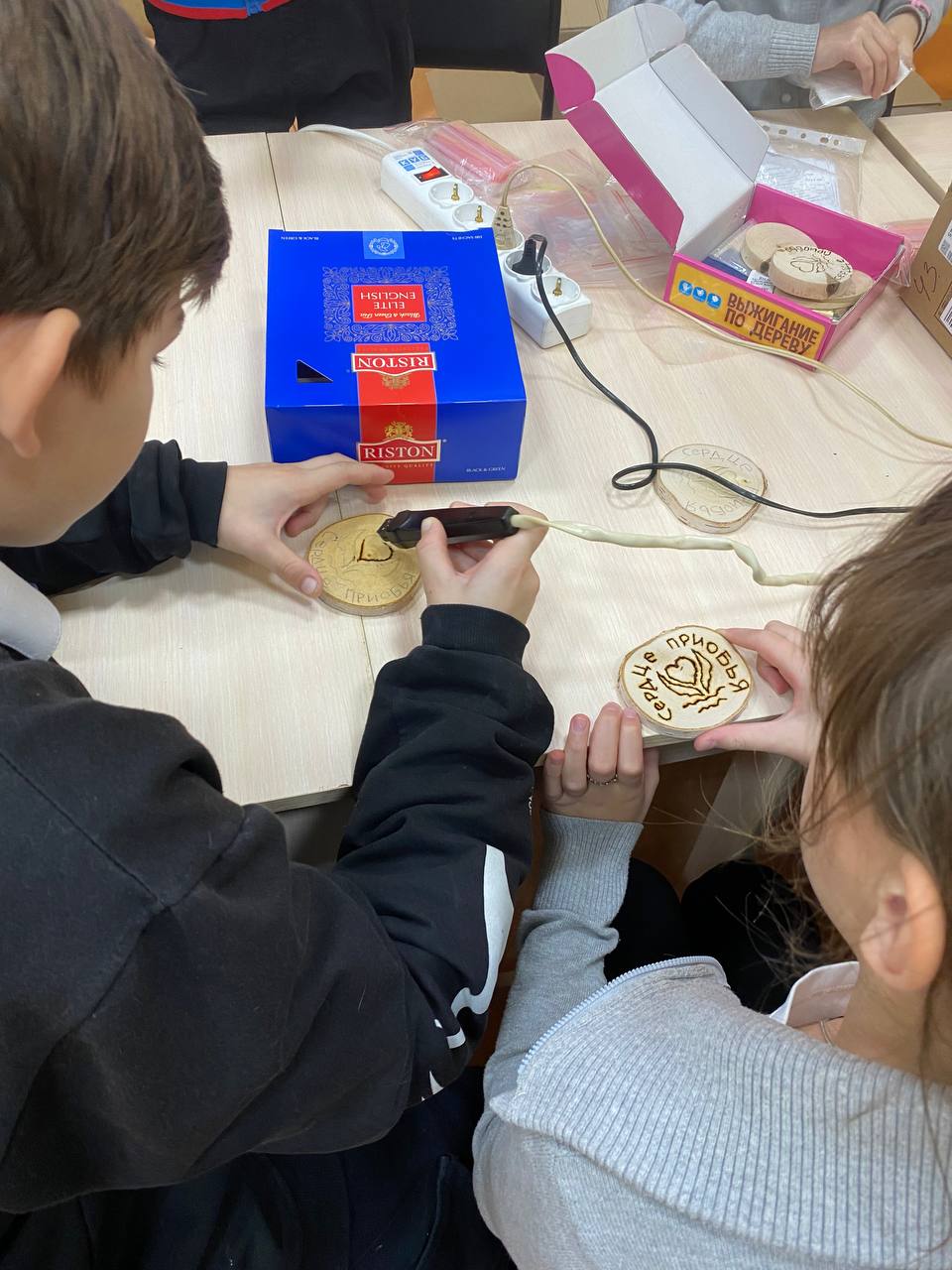 Помимо изготовления защитных средств бойцам в зону СВО председатель районной Думы, руководитель местной общественной приемной «Единой России» в Октябрьском районе Наталия Кочук, соцкординатор фонда «Защитники Отечества» Антонина Акулова, вместе с учащимися и классными руководителями Приобской начальной школы изготовили обереги в виде ангелочков, выжигали эмблемы.