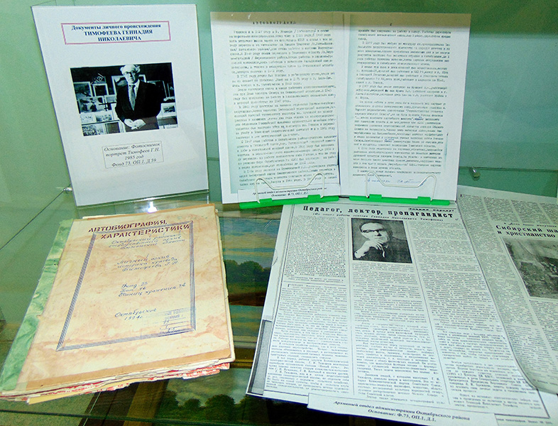 4 апреля 2016 года работники архивного отдела администрации Октябрьского района открыли выставку архивных документов «Геннадий Николаевич Тимофеев – педагог, историк, краевед».