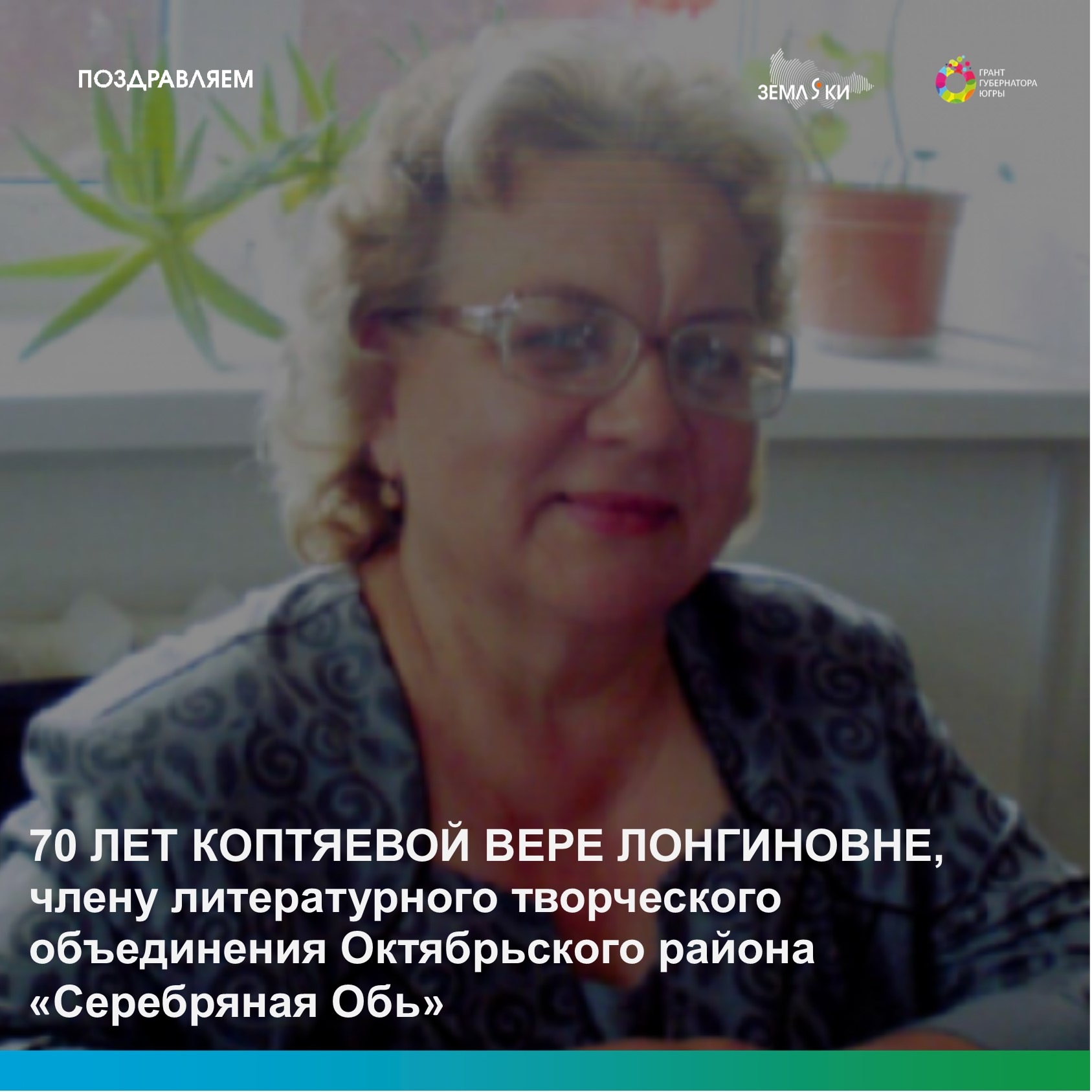 18 сентября свой юбилей отмечает член литературного творческого объединения Октябрьского района "Серебряная Обь" Коптяева Вера Лонгиновна.