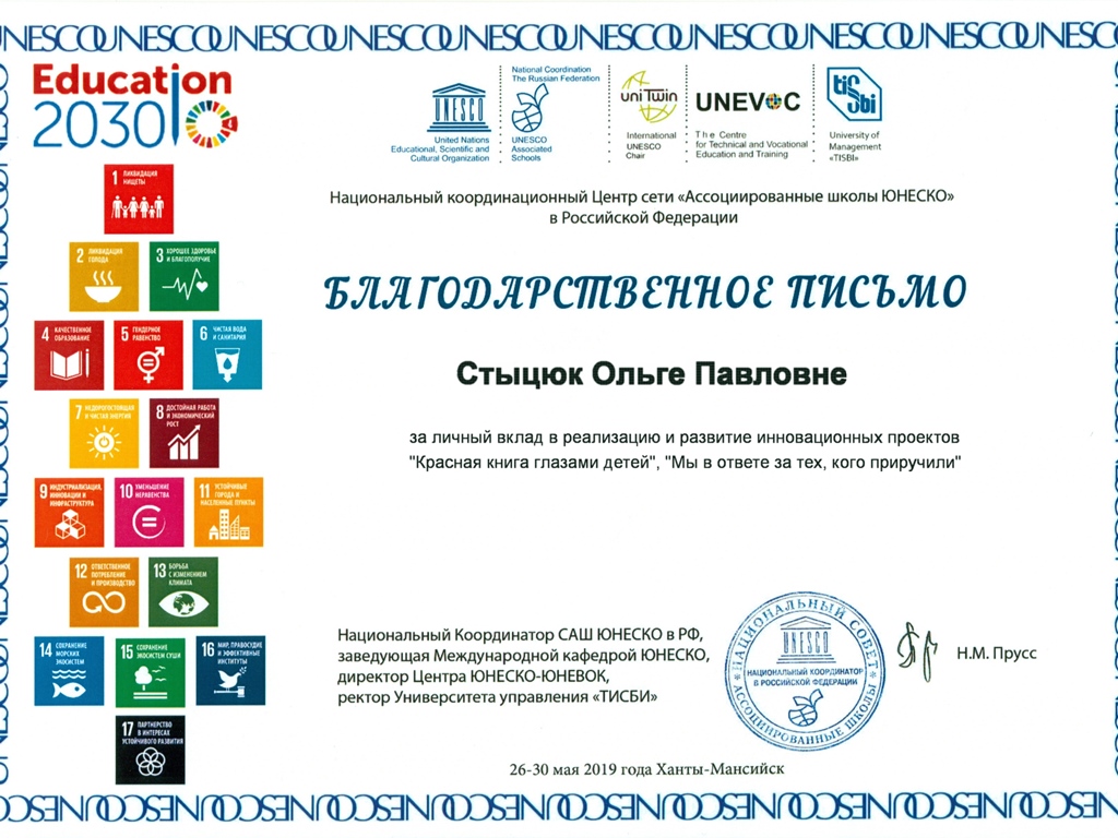Кроме Диплома победителя, копилка наград музея пополнилась Благодарственным письмом НКЦС "Ассоциированные школы ЮНЕСКО" в Российской Федерации за реализацию и развитие инновационных проектов "Красная книга глазами детей" и "Мы в ответе за тех, кого приручили".