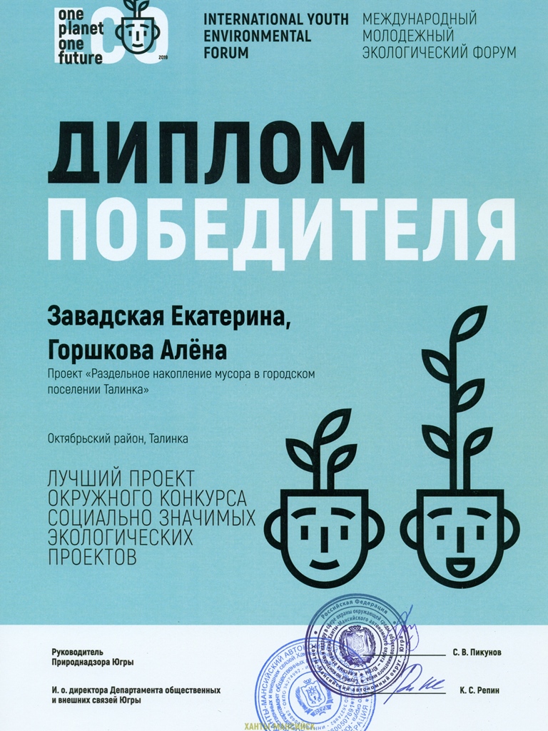 Обучающиеся МКОУ "СОШ №7" гп. Талинка Завадская Екатерина и Горшкова Алена, эковолонтеры музея "Отражение", члены школьного лесничества "Родник", приняли участие в работе Форума. Представленный ими проект "Раздельное накопление твердых коммунальных отходов в городском поселении Талинка" (руководитель проекта Стыцюк Ольга Павловна) стал победителем в номинации "Лучший проект конкурса социально-значимых экологических проектов".