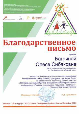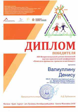С 29 по 30 марта в г. Ханты-Мансийск прошла XIII Межрегиональная детско-юношеская научно-практическая конференция «Ремёсла и промыслы: прошлое и настоящее».На конференции «Музейно-выставочный центр» представлял Валиуллин Денис. Под руководством Багриной О.С. – хранителя фондов МБУК «Музейно-выставочный центр» Денис подготовил исследовательскую работу «Забытое ремесло», которая рассказывает об истории и технике работы на хантыйском бердо.Прежде эта работа уже была высоко оценена на районных и международных конкурсах и этот раз не был исключением.По итогам жюри данная исследовательская работа получила диплом победителя конференции, а также приглашение к участию в международном конкурсе «Лестница наук», который проводится в г. Москва.Кроме того, наш юный исследователь самостоятельно провёл практический мастер-класс для взрослых и детей «Плетение хантыйского опояска», по прошествии которого ему был вручен именной сертификат, а также сам поучаствовал в разных мастер-классах от других участников и мастеров своего дела: «Пижемская роспись на спиле», «Мезенская роспись на спиле», «Изготовление гончарного изделия» и многие другие.Атмосфера конференции была наполнена радостью и весельем, все присутствующие принимали активное участие в развлекательной программе, и никто не остался в стороне, а практическая значимость этого события позволяет задуматься, что именно такие мероприятия помогают вновь развить интерес у младшего поколения к сохранению и развитию традиционных художественных промыслов и ремесел народов Югры.