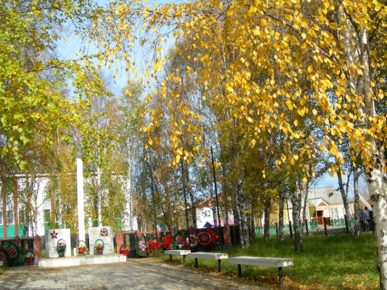 Памятник воинам - Октябрьцам, погибшим в годы Великой Отечественной войны был торжественно открыт 09 мая 1967 года. Автор и исполнитель - В.В. Матвеев. В 1995 году памятник был обновлен, поставлены мраморные плиты с надписью "Воинам - Октябрьцам от благодарных земляков" и установлен вечный огонь. Справа и слева от памятника в нишах из кирпичной кладки установлены плиты с именами солдат и офицеров, погибших на фронте.