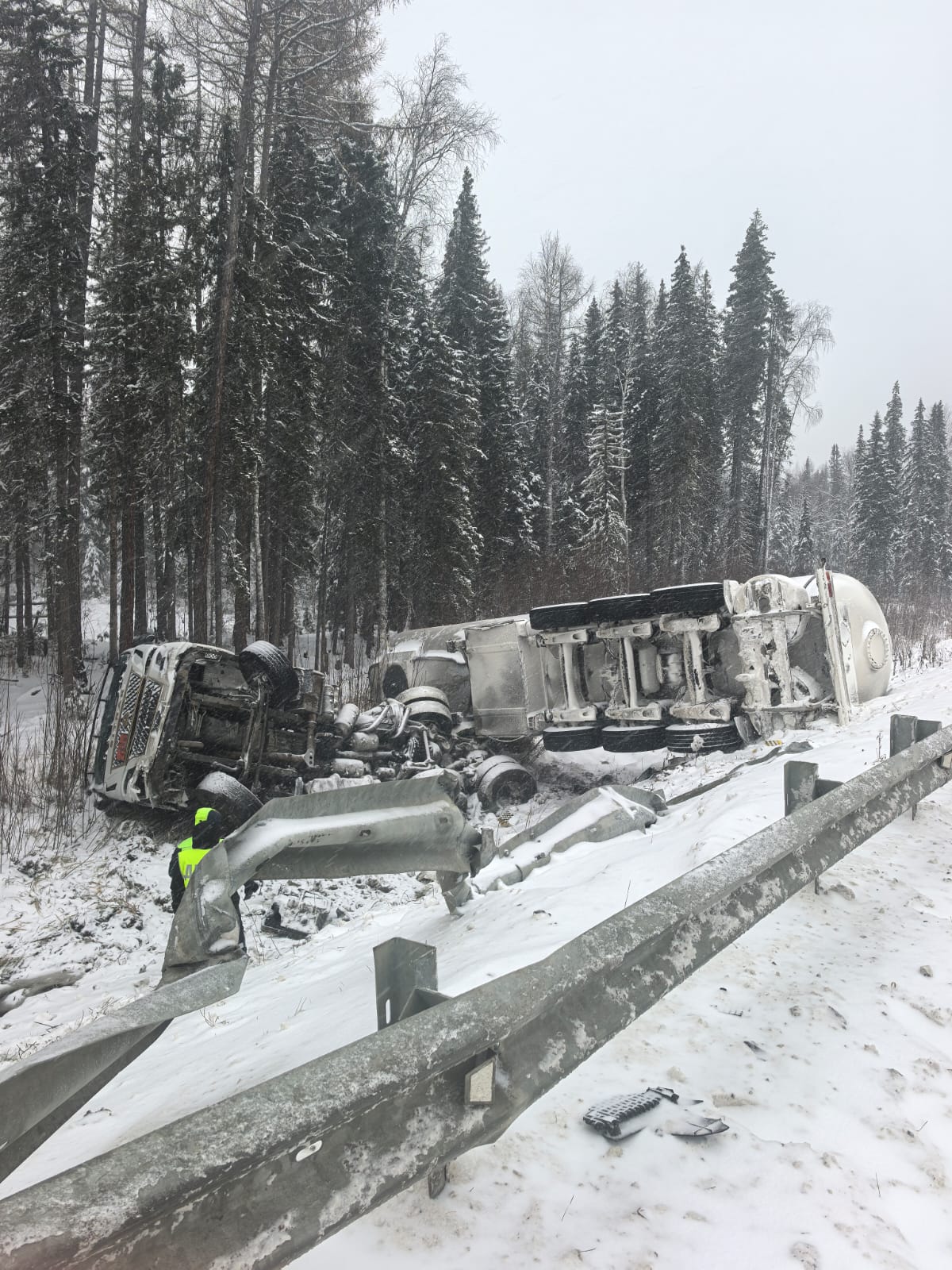 10 ноября 2025 года в 12:00 на 105 км автодороги "Советский - Нягань" водитель 1975 года рождения, управляя транспортным средством «SITRAK» в составе с полуприцепом, по предварительным данным, не выбрал безопасную скорость, не справился с управлением и допустил наезд на дорожное ограждение с последующим съездом в кювет и опрокидыванием.