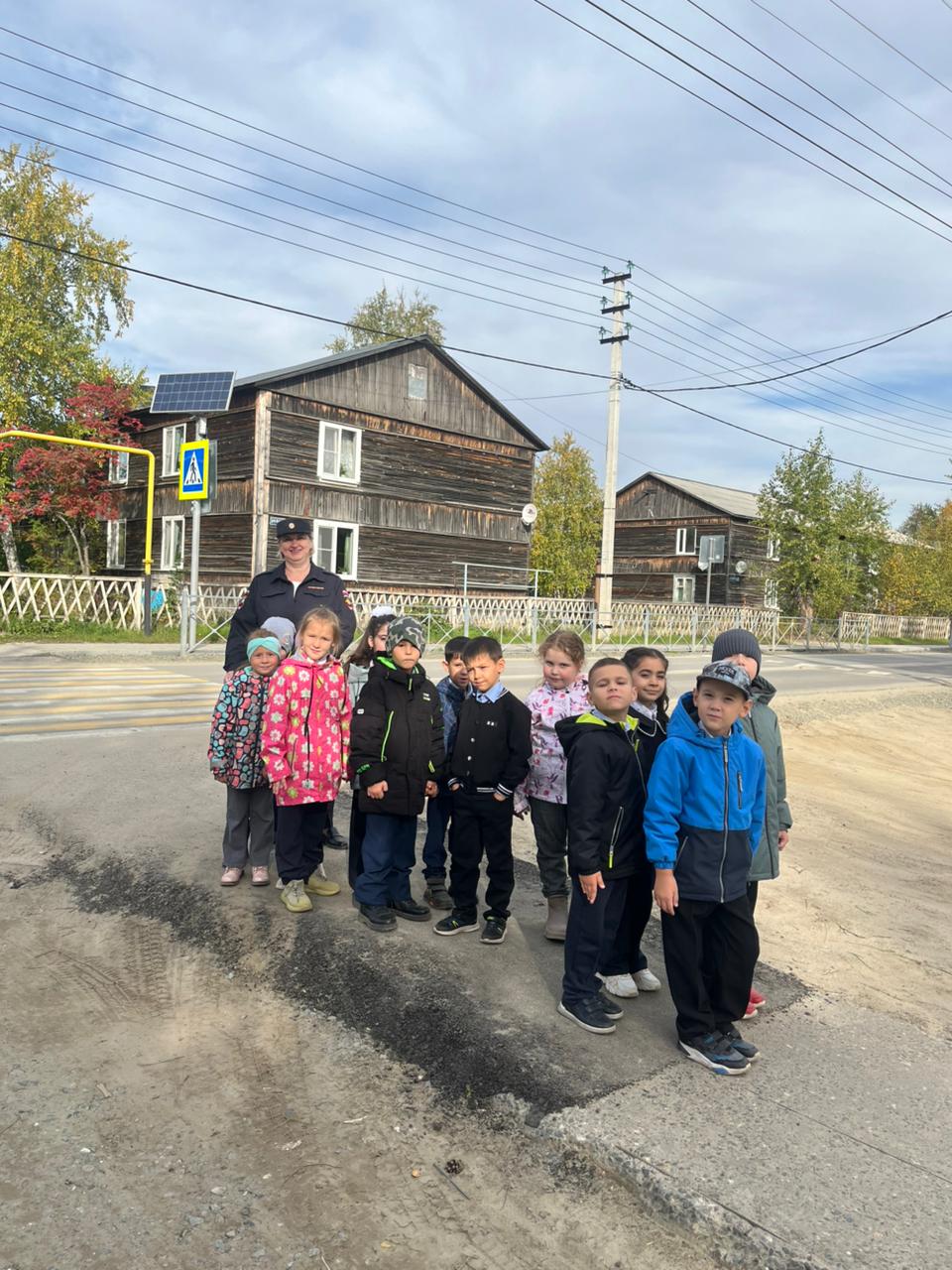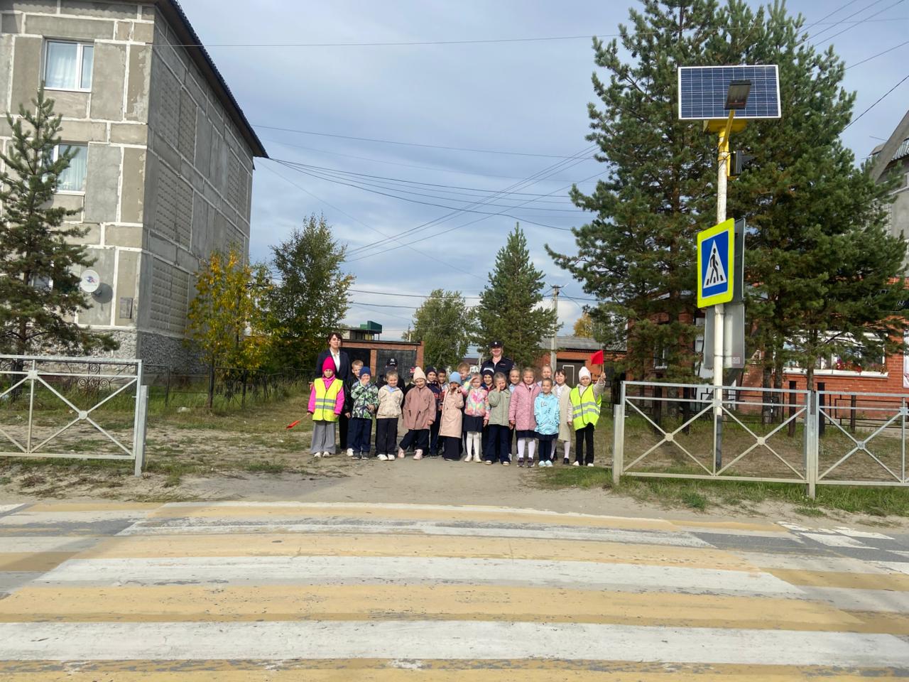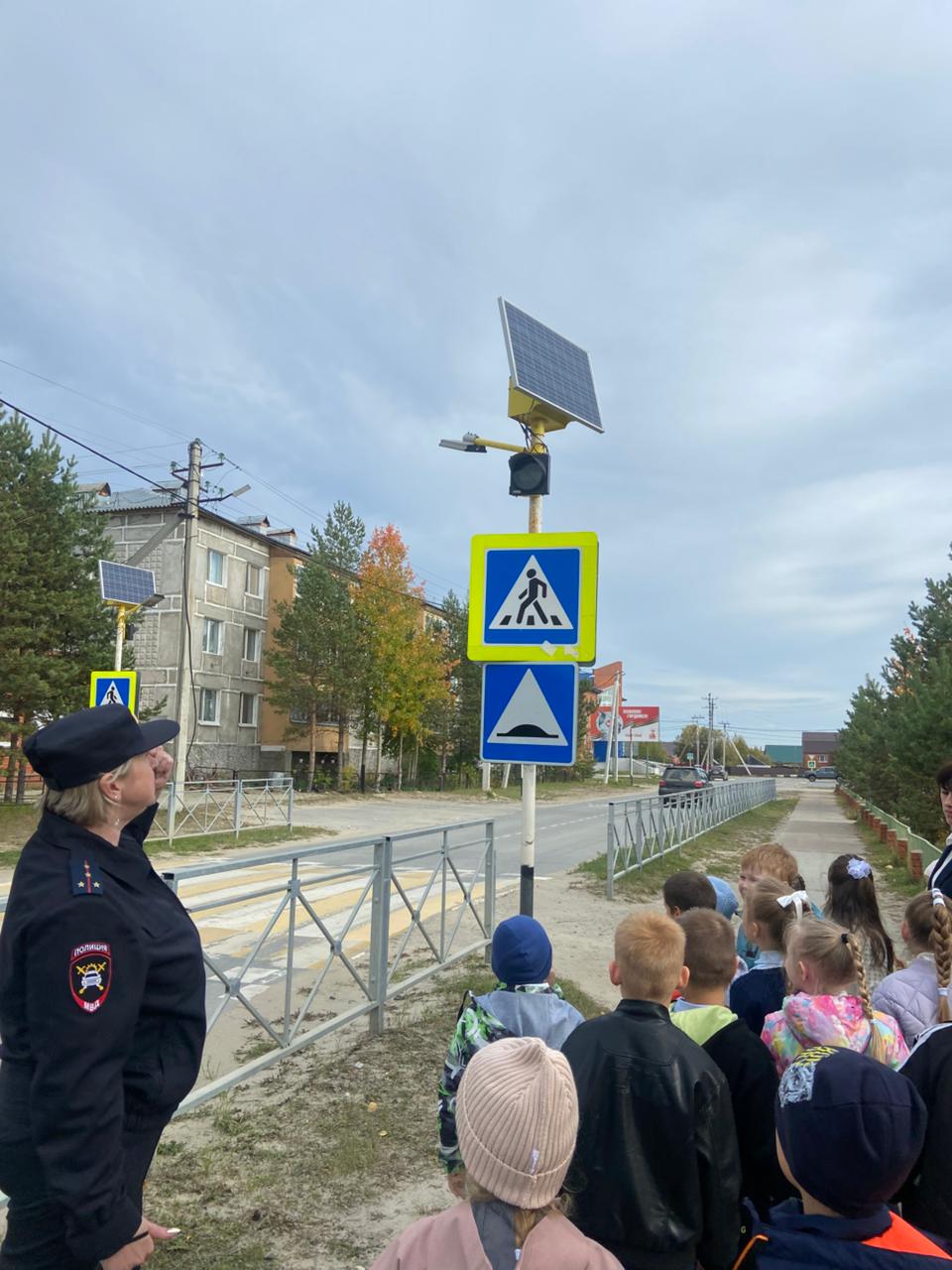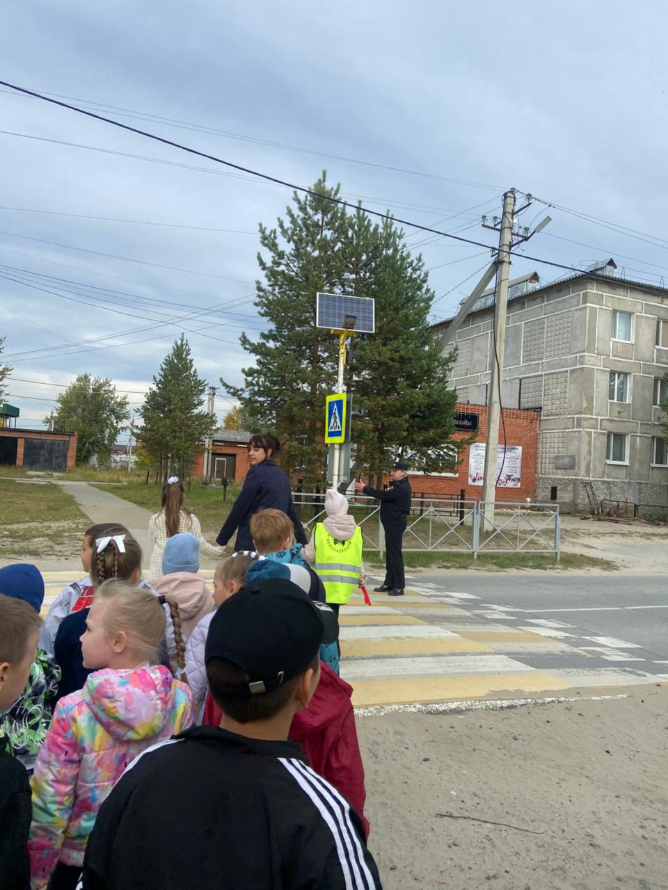 Полицейские вместе с учащимися вышли к пешеходному переходу у школы, где рассказали им о правилах перехода улицы, обратив внимание на нормы правильного поведения возле проезжей части, а также важности ношения световозвращающих элементов на одежде и портфелях в тёмное время суток.