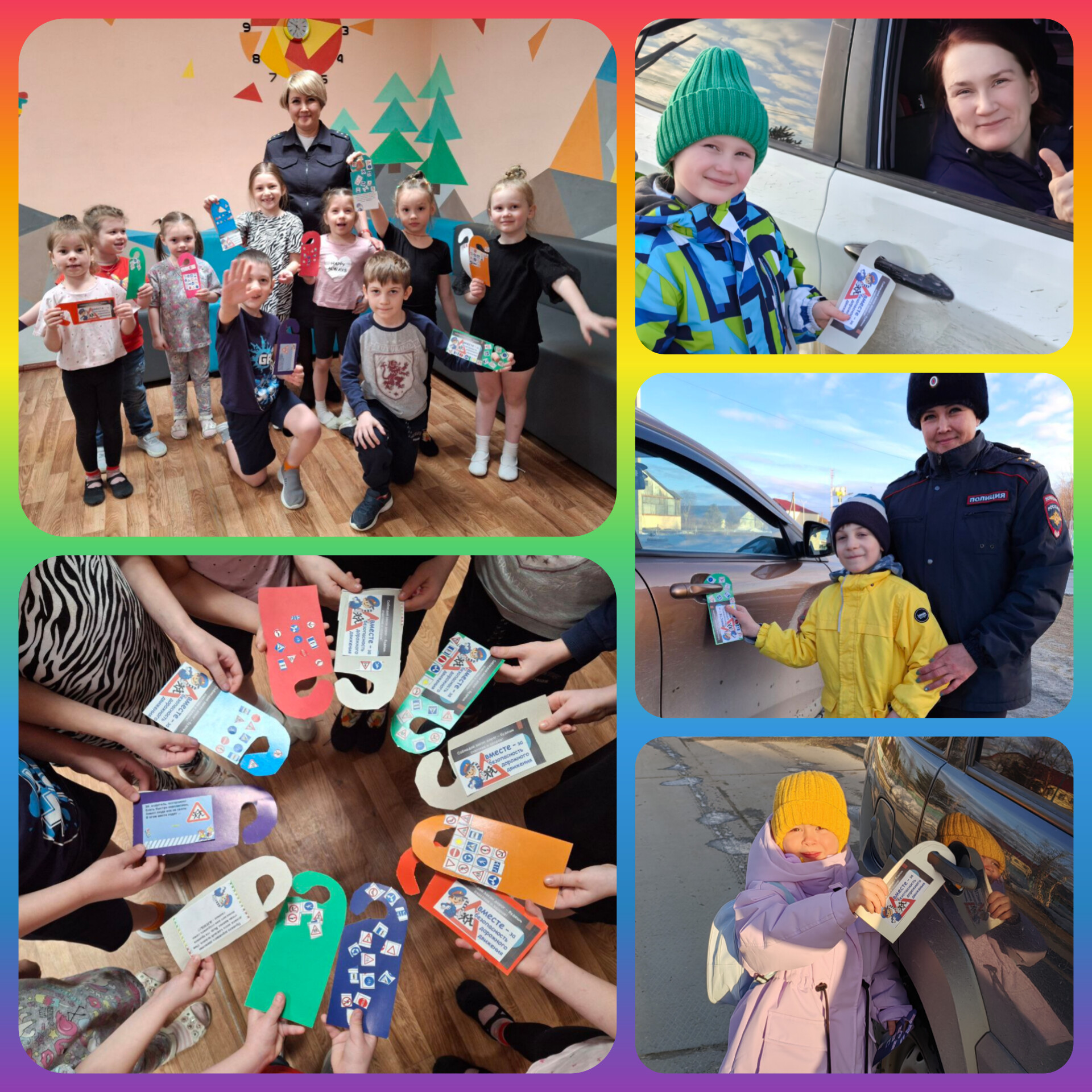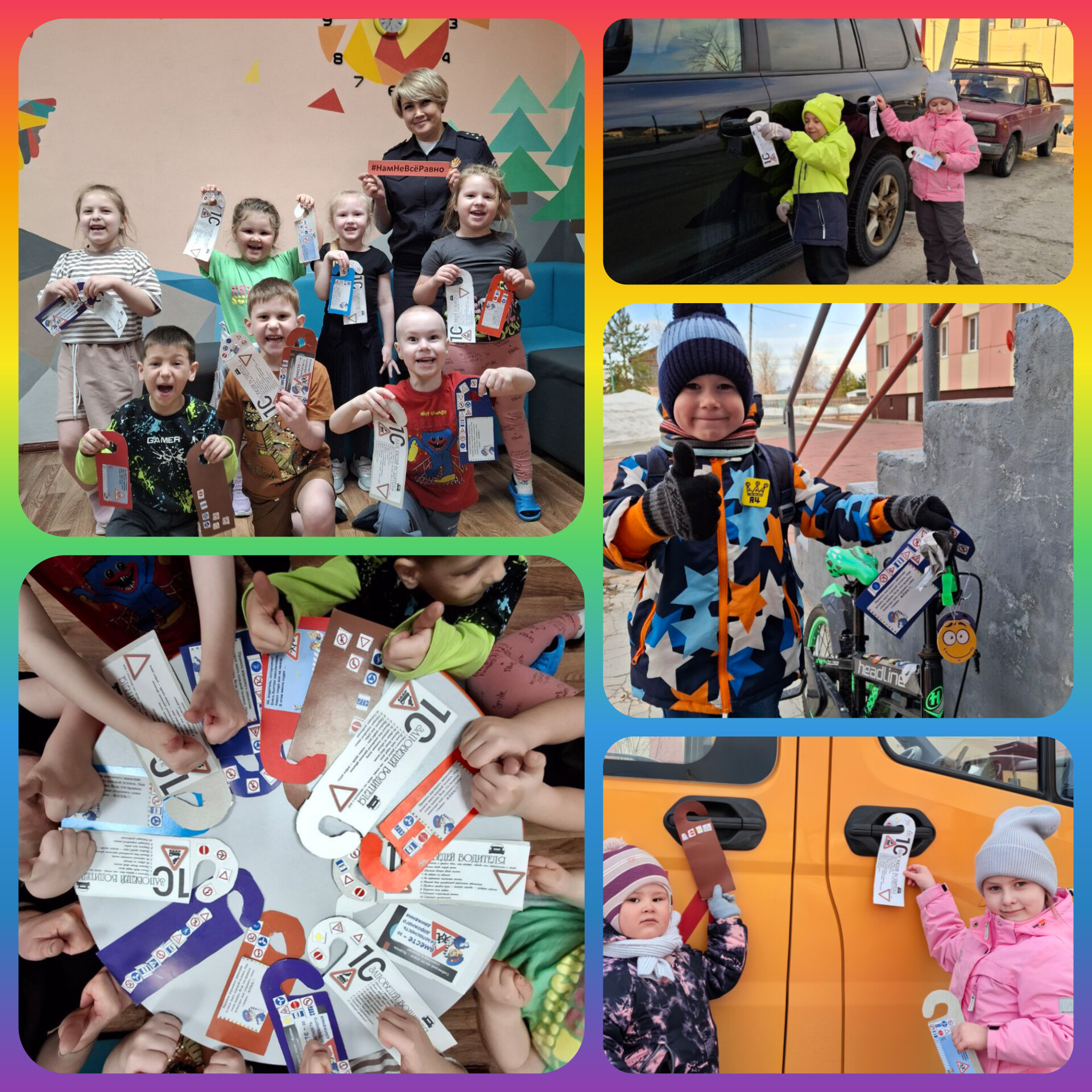 В начале занятия ребята показали автоинспектору свои знания правил безопасного поведения на улично-дорожной сети, обсудили какие опасности могут подстерегать детей на дороге. А затем изготовили тематические дорхендеры и повесили на ручки дверей припаркованных машин, а также вручили своим родителям.